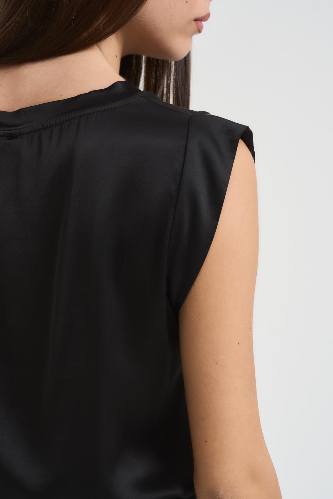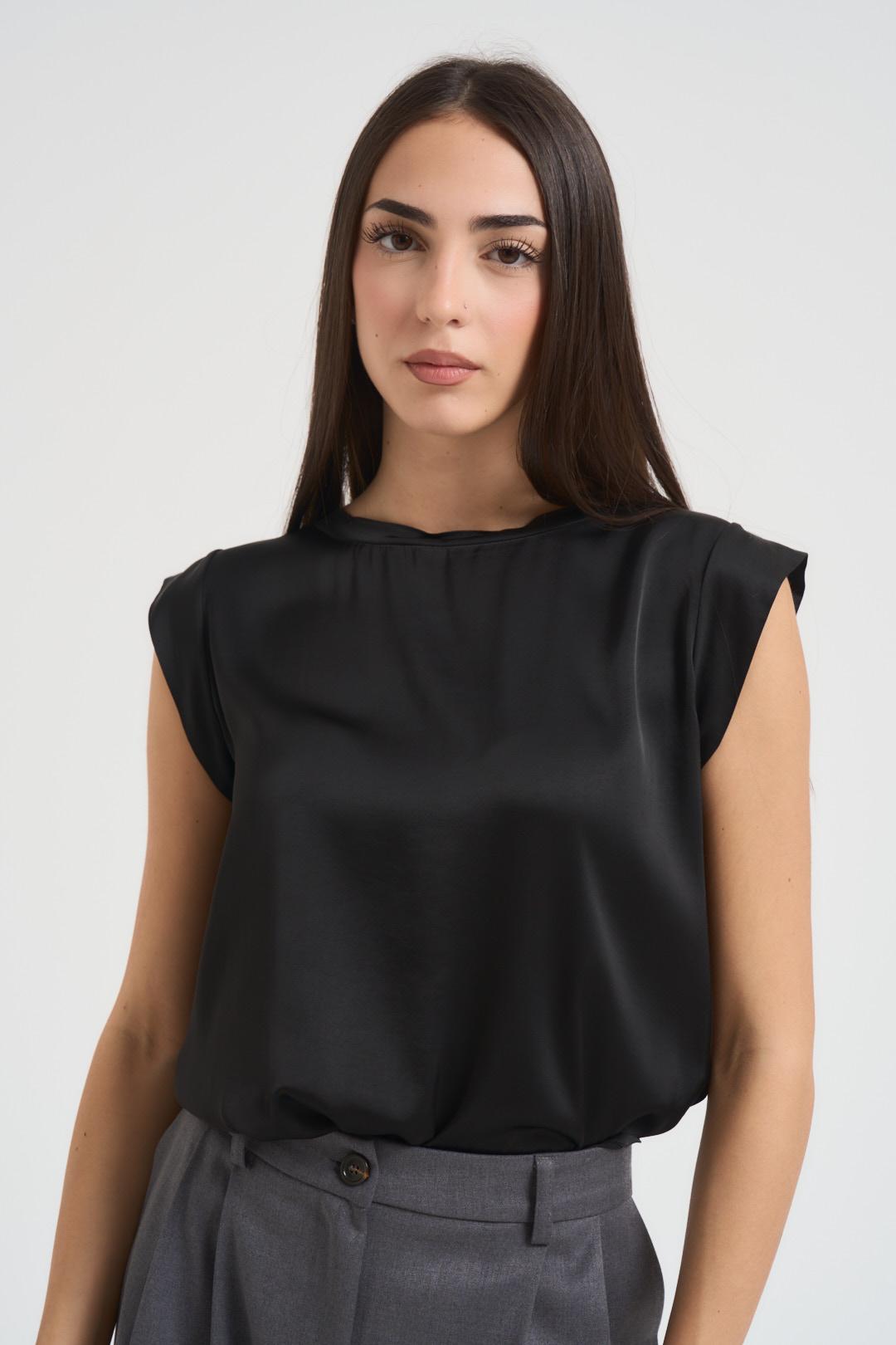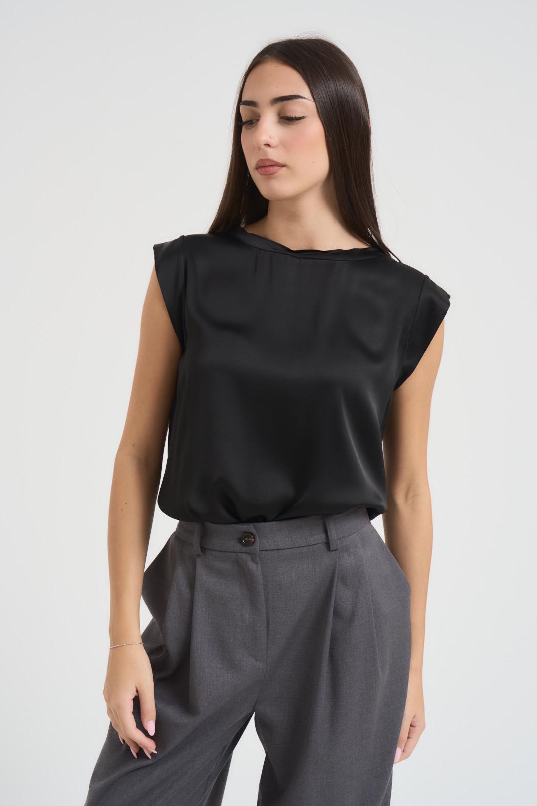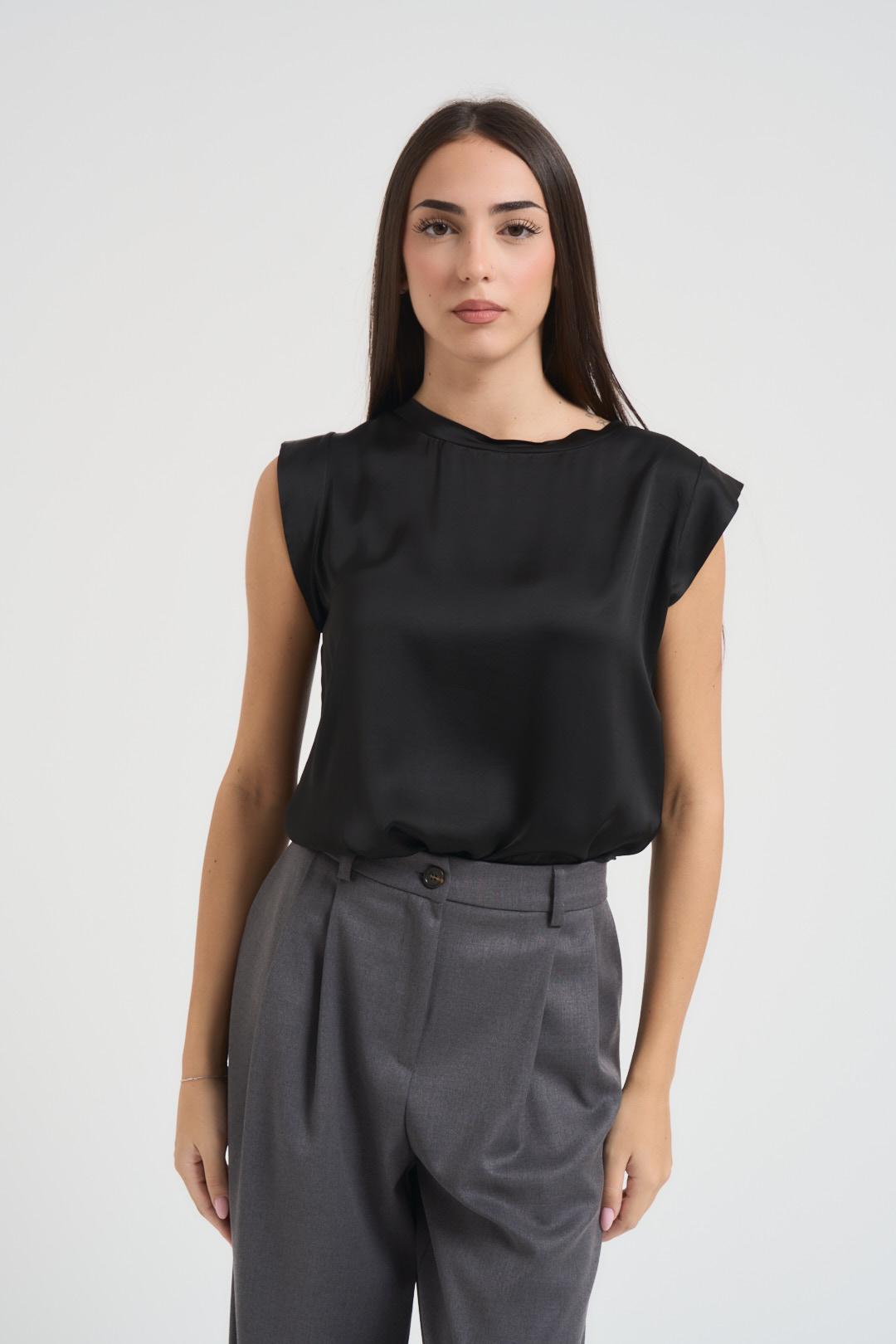MOTEL Top donna smanicato nero. Modello con collo a barchetta, senza maniche. Tessuto leggermente elasticizzato. Composizione: 97% Viscosa 3% Elastan. La modella è alta 172 cm e indossa la taglia S.