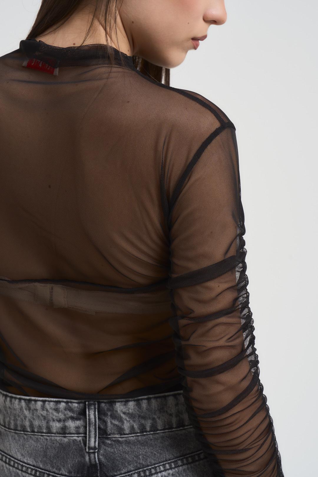 KONTATTO Top donna trasparente nero. Modello a mezzo collo, manica lunga drappeggiata, slim fit. Composizione: poliestere. La modella è alta 172cm e indossa la taglia S.