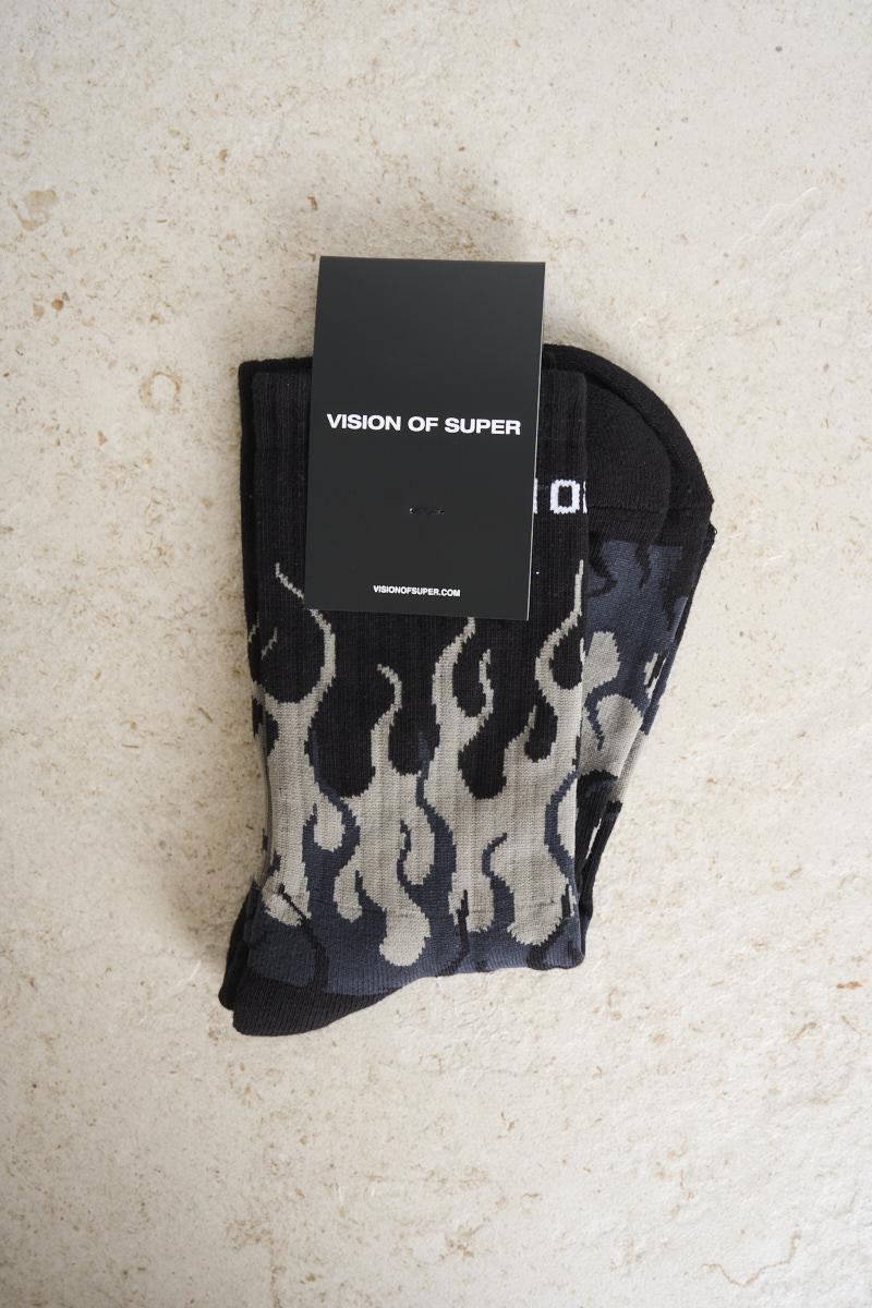 VISION OF SUPER Black and grey men's socks. Grey and black flame pattern. Composition: 80% cotton, 15% polyester, 5% spandex.