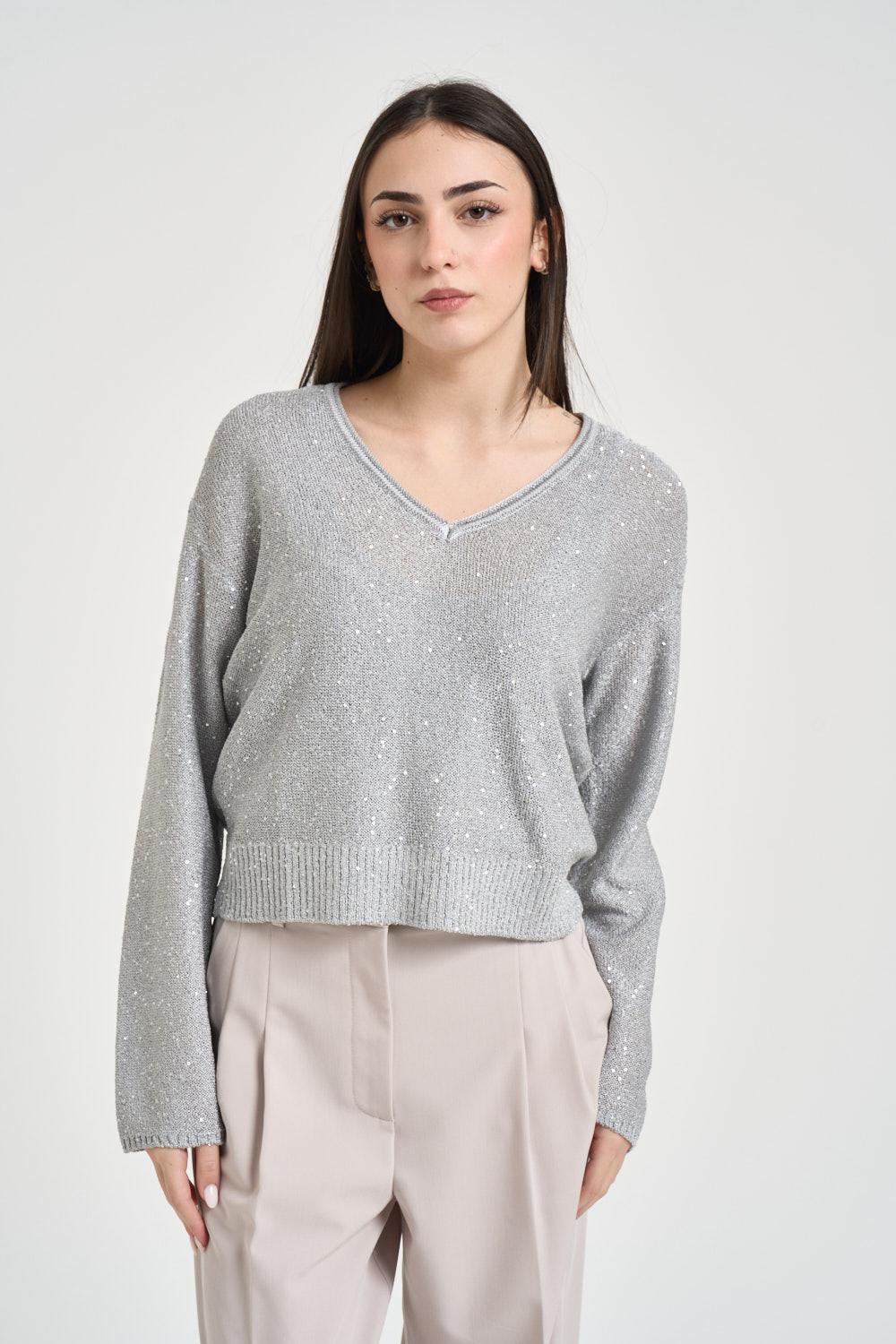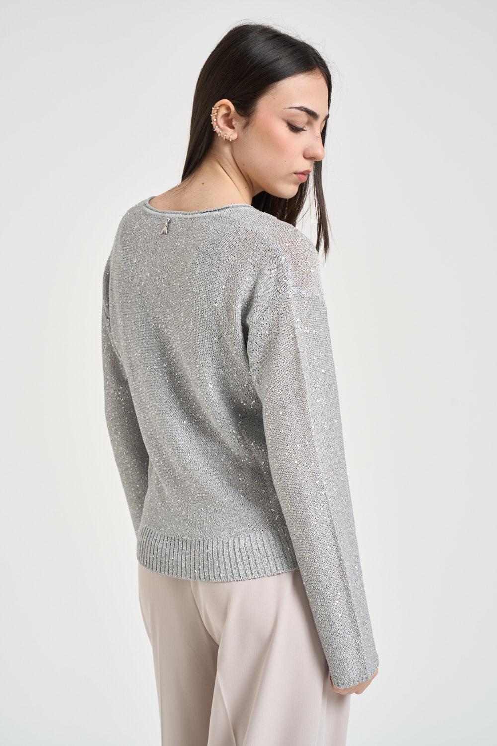 PATRIZIA PEPE Maglia donna scollo a V argento. Modello dalla vestibilità morbida. Manica lunga. Dettagli a costine. Lavorazione della maglia in rasato con applicazione all-over paillettes. Dettaglio Fly in metallo sul retro del collo. Composizione: 100% poliestere. La modella è alta 172 cm e indossa la taglia 1.