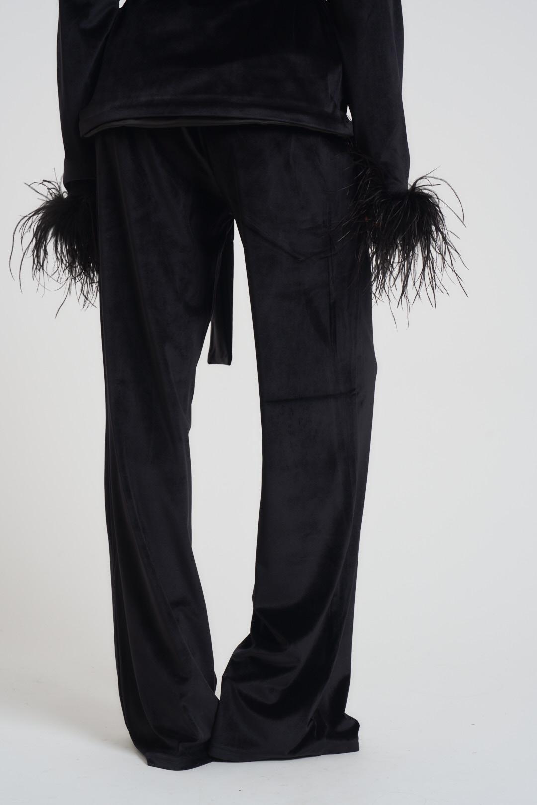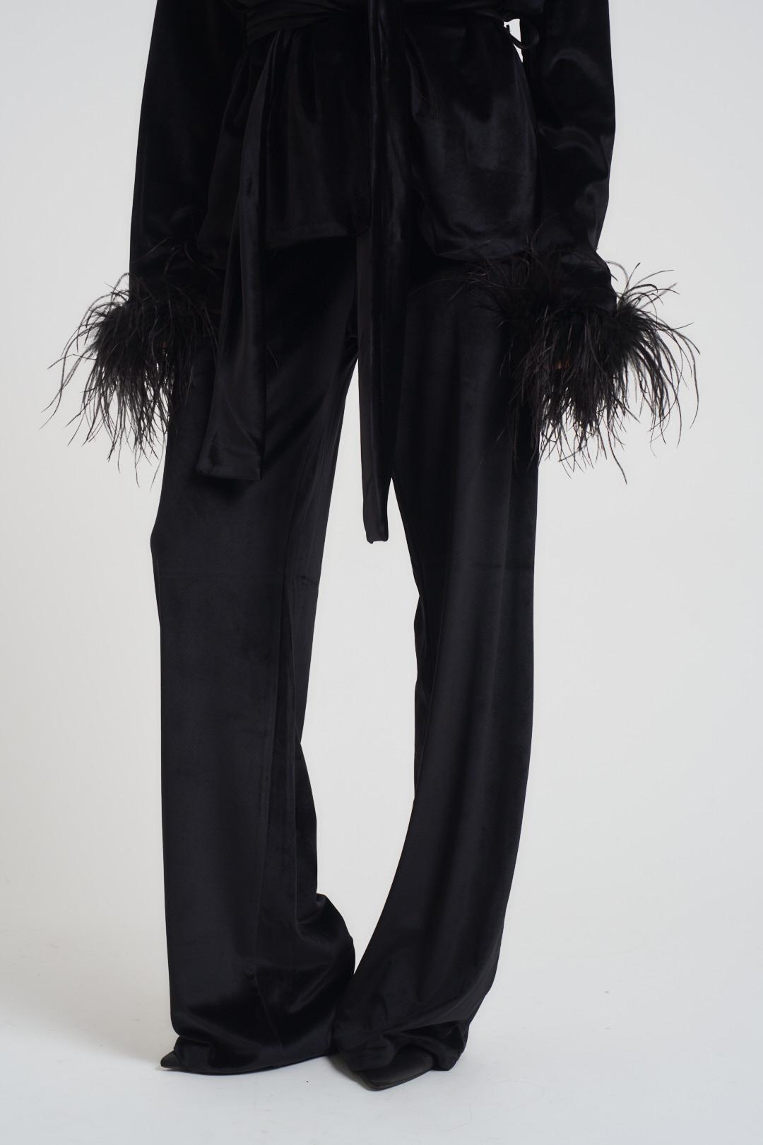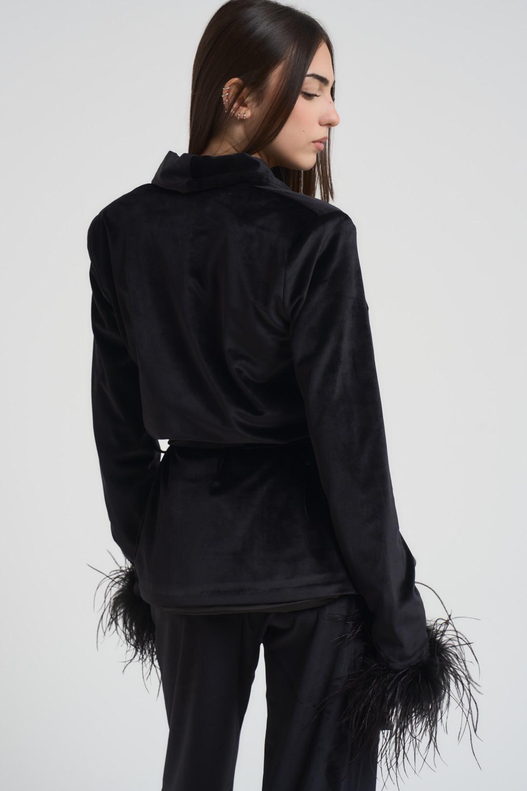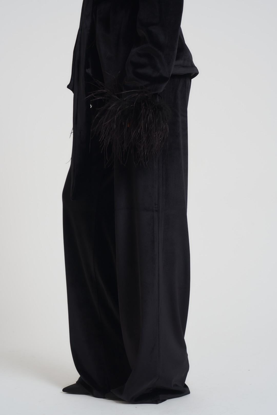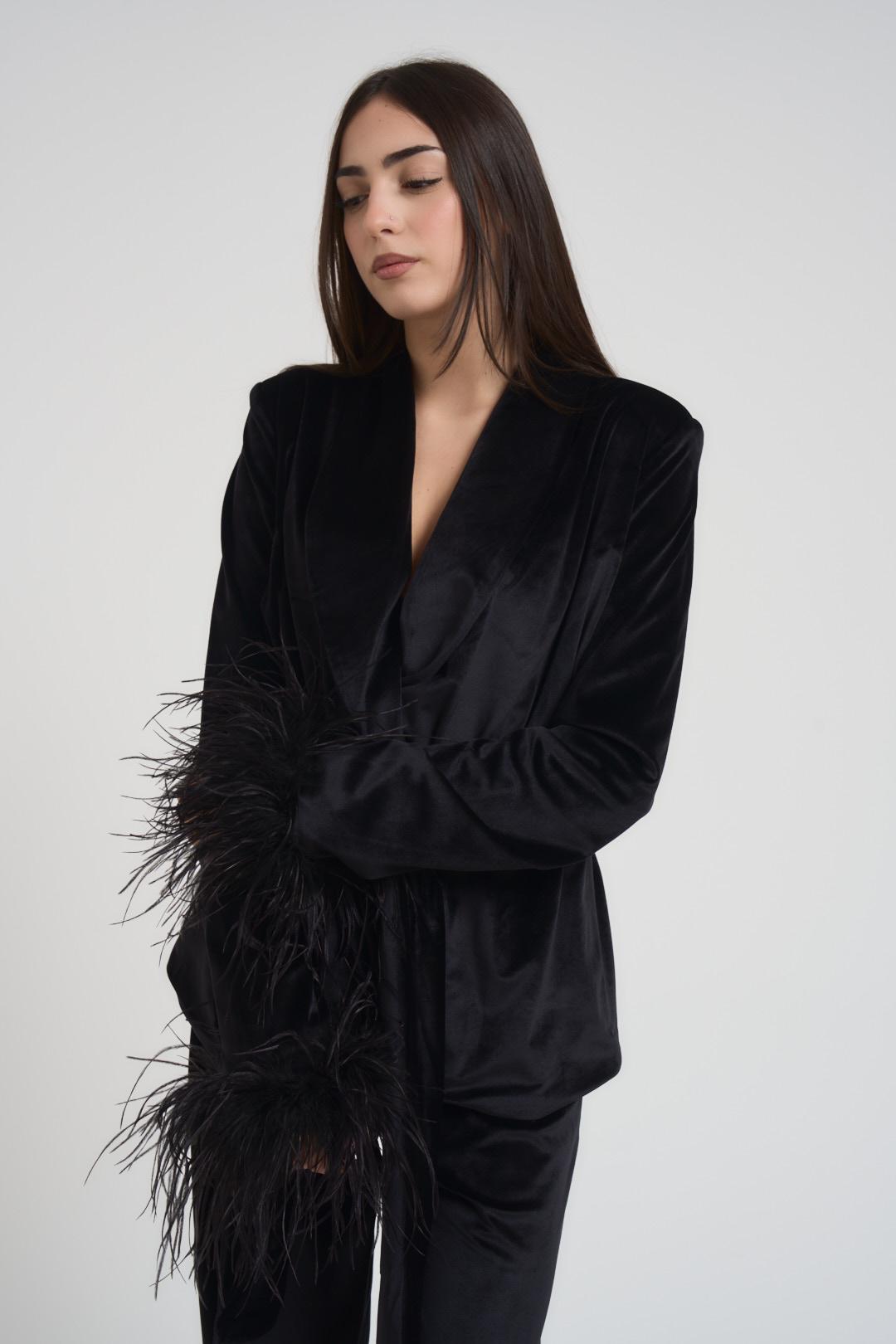 TWENTY FOURHAITCH Abito completo donna in velluto nero. Tailleur composto da giacca con collo a rever, Chiusura con cintura removibile e piume sul fondo manica. Pantalone a palazzo dritto con elastico in vita. Vestibilità morbida. Composizione: misto poliestere.