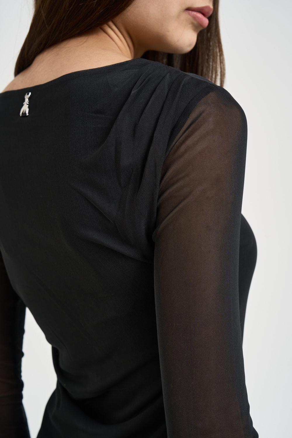 PATRIZIA PEPE Abito donna aderente nero. Modello elasticizzato con maniche semitrasparenti. Girocollo. Targhetta logo metallizato sul retro. Composizione: 95% poliestere, 5% elastane. La modella è alta 172 cm e indossa la taglia 1.