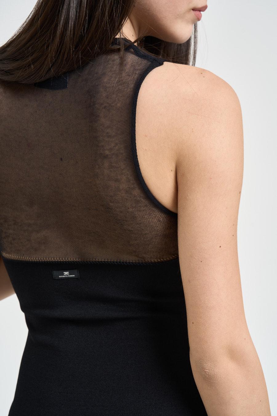 ELISABETTA FRANCHI Abito donna aderente nero. Modello slim fit. Smanicato. Trasparenze. Composizione: 62% viscosa, 34% poliammide, 4% cotone. La modella è alta 172 cm e indossa la taglia 40.
