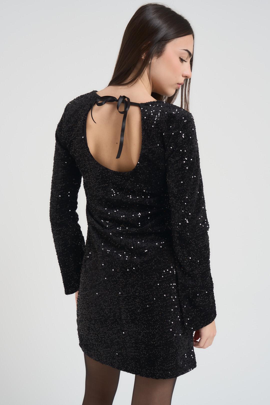 LOKITA MILANO Abito donna corto con paillettes nero. Modello girocollo con dettaglio scollo sulla schiena e chiusura con fiocco satinato nero. Manica lunga. Copmposizione: 100% poliestere. La modella è alta 172 cm e indossa la taglia unica.