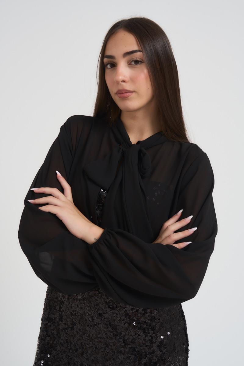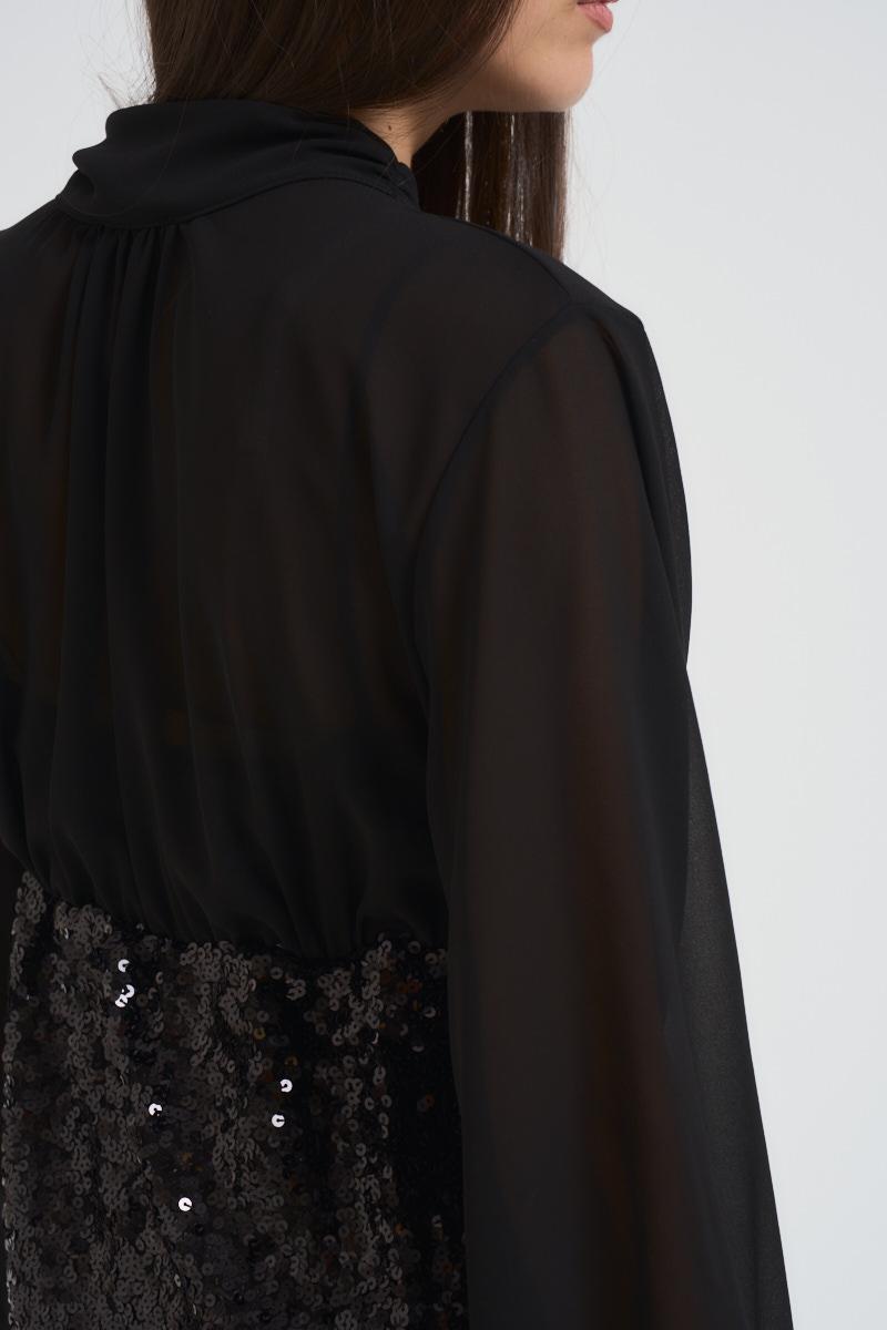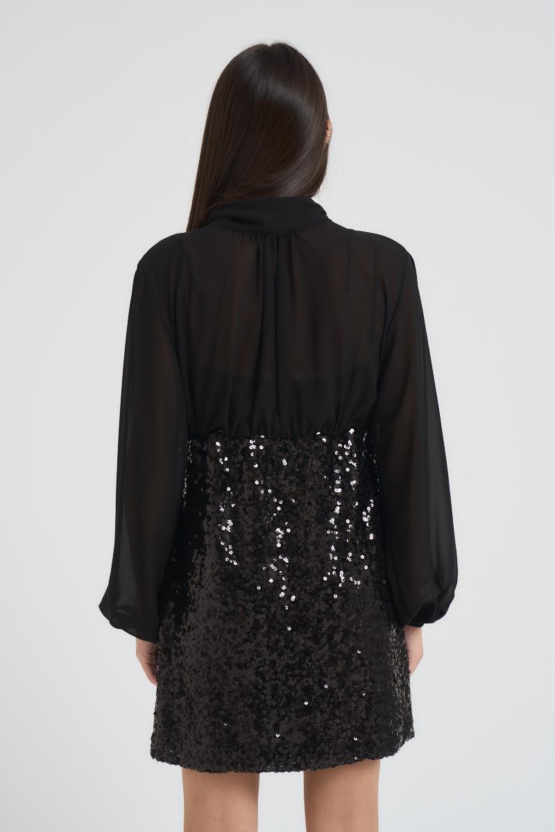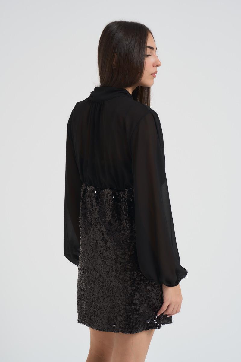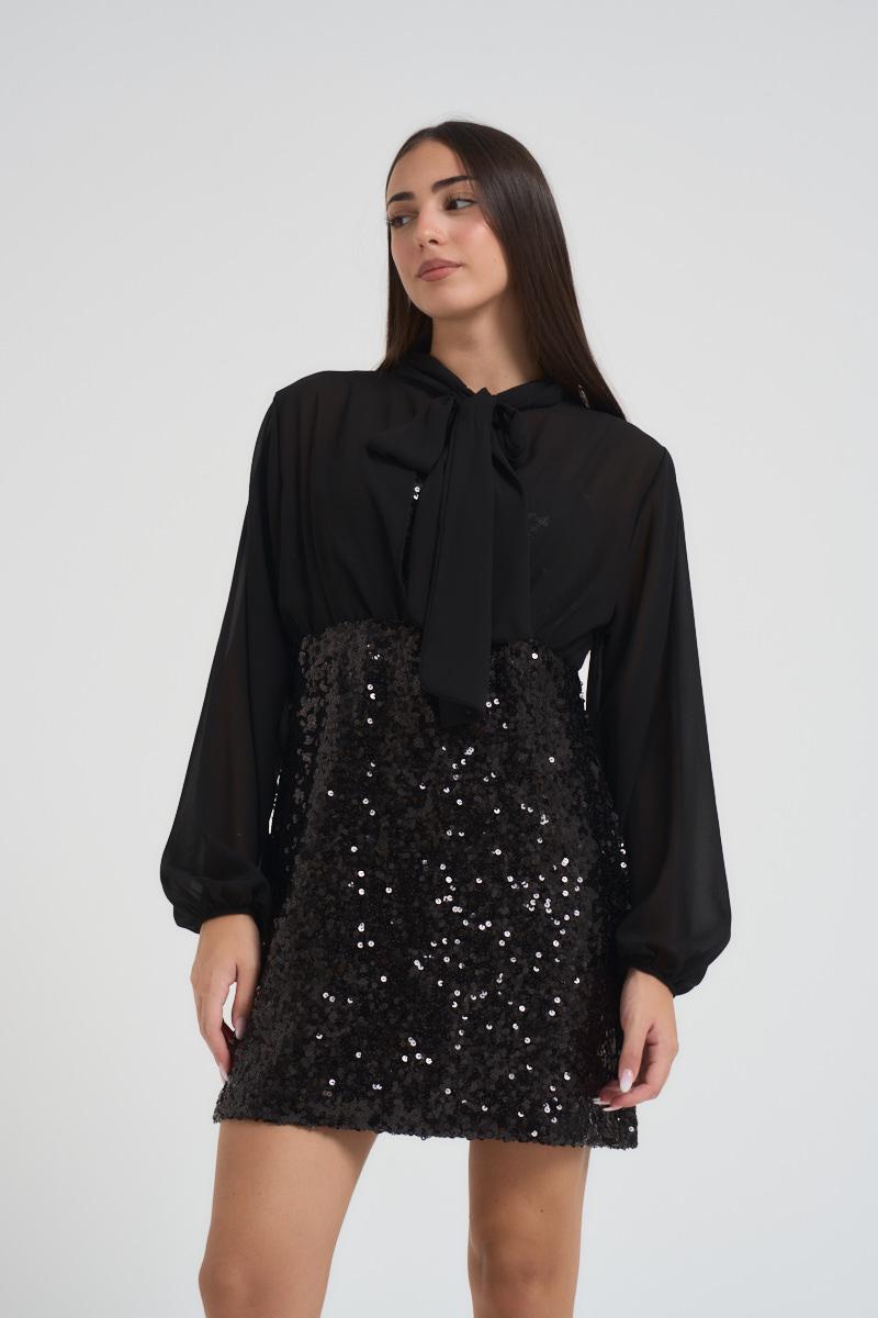 LOKITA MILANO Abito donna corto con paillettes nero. Modello composto da blusa con manica a palloncino, mezzo collo con fiocco e tessuto semitrapsarente. Gonna corta con paillettes. Composizione: poliestere. La modella è alta 172 cm e indossa la taglia S.