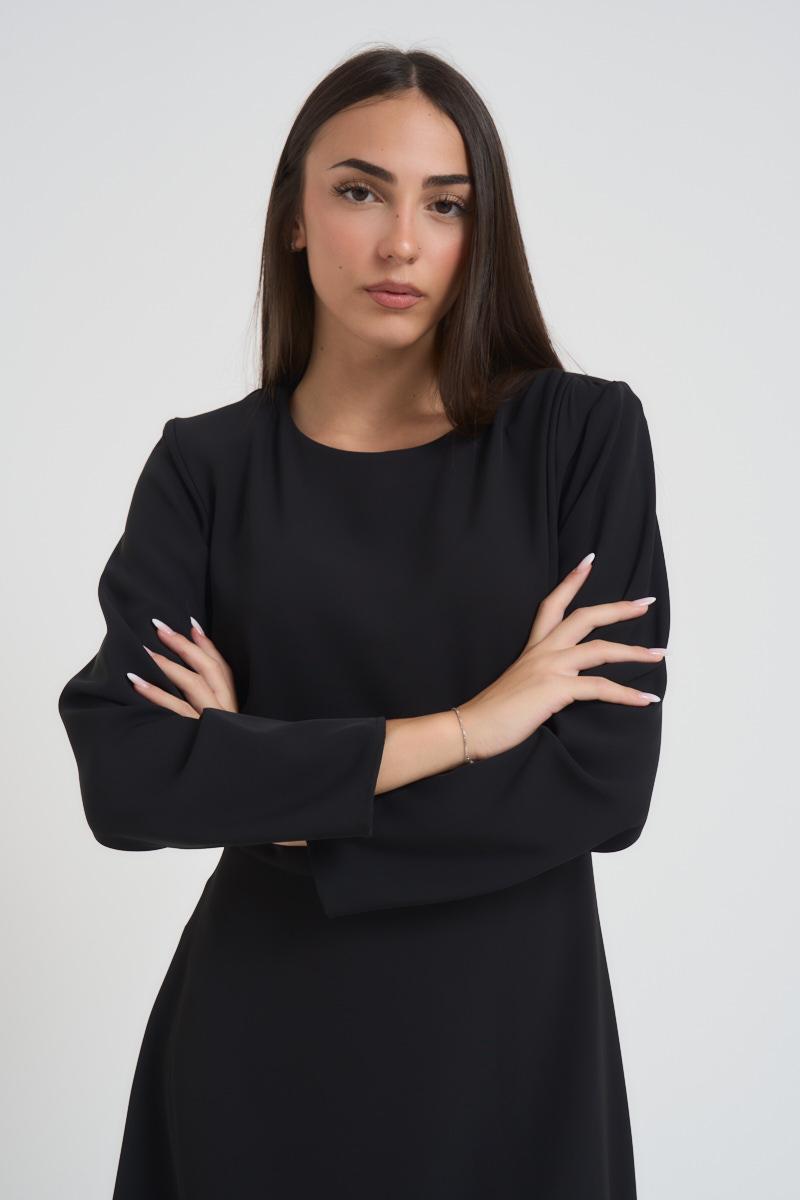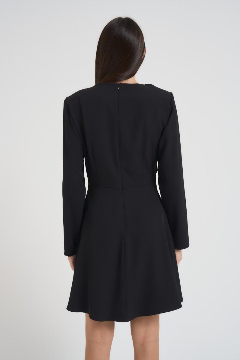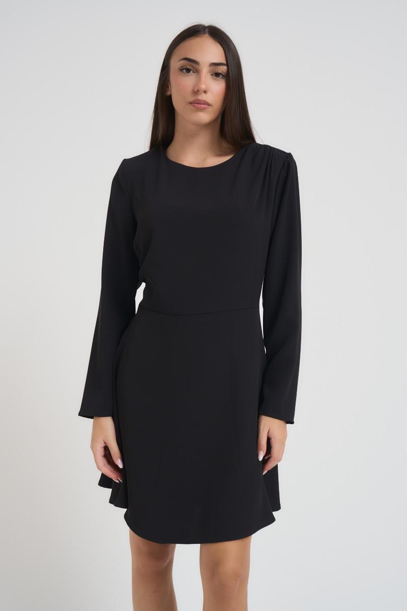 LOKITA MILANO Abito donna corto nero. Modello a manica lunga e girocollo, gonna svasata e manica a campana. Composizione: poliestere. La modella è alta 172 cm e indossa la taglia S.