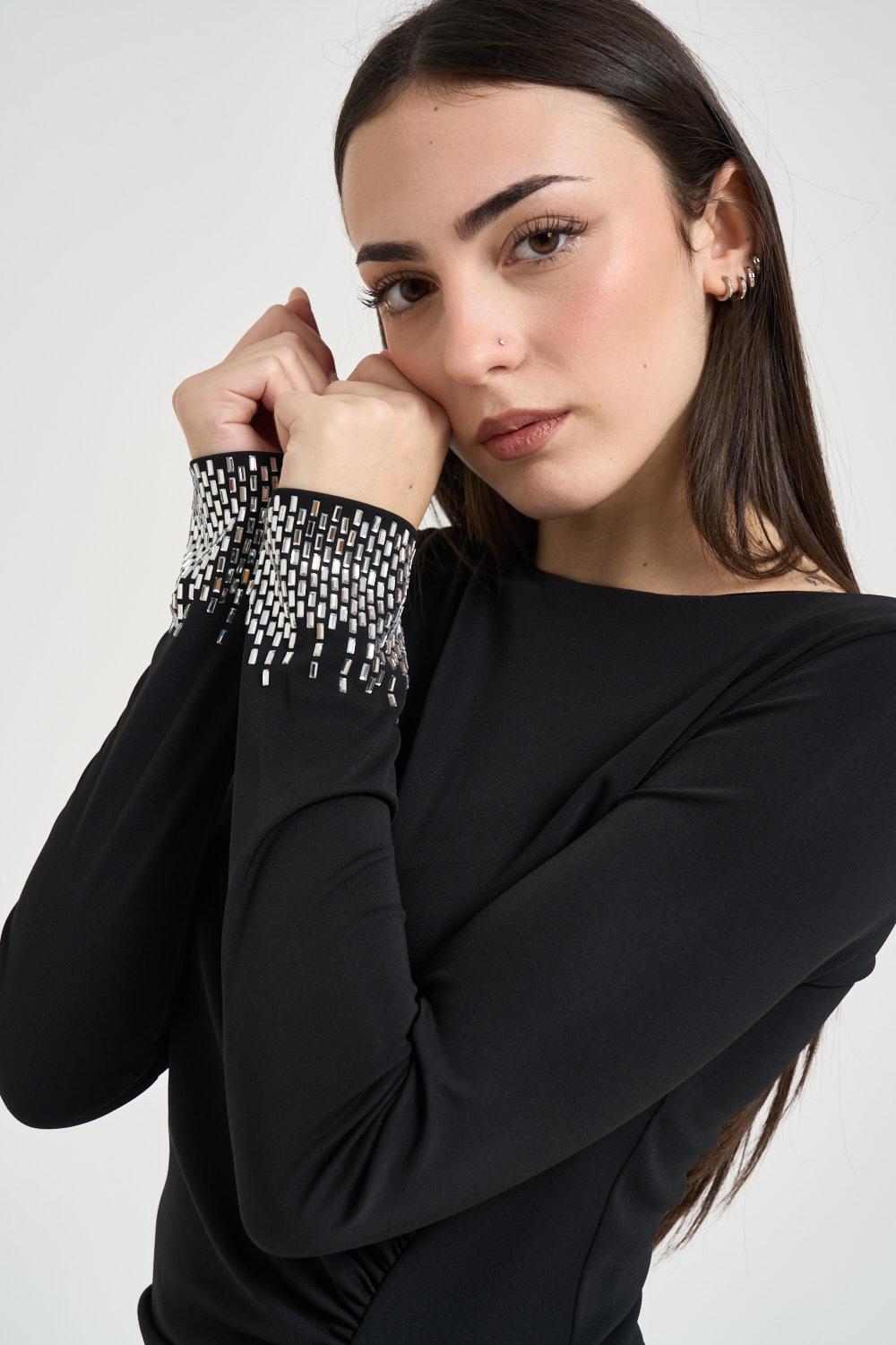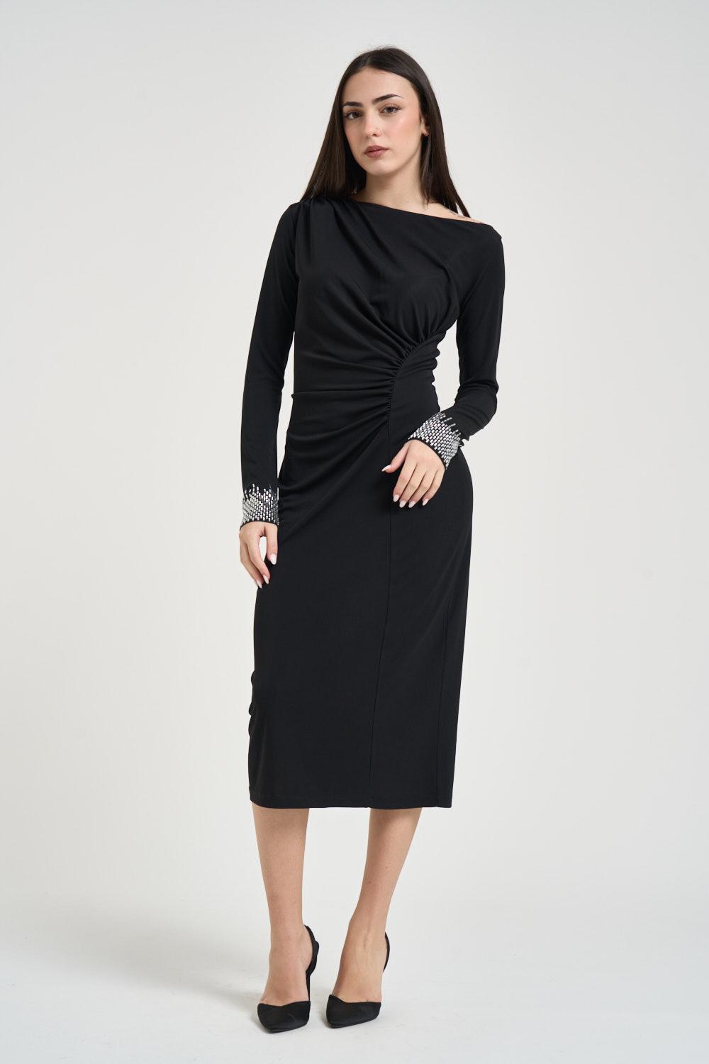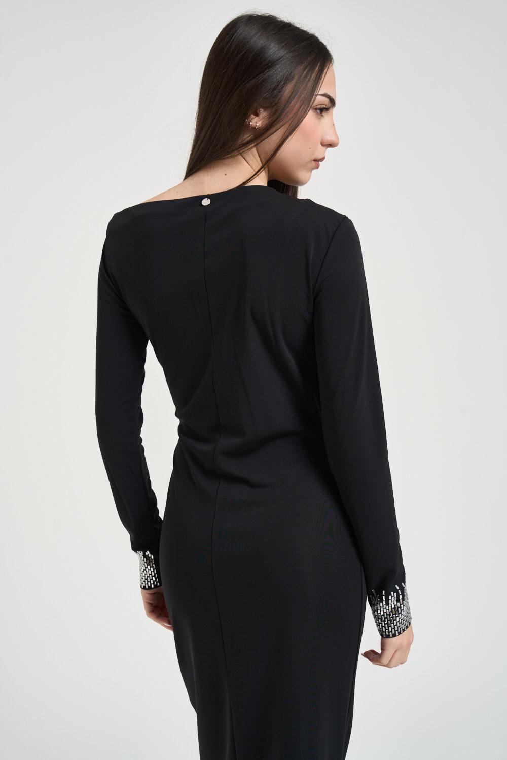 LIU JO Abito donna drappeggiato nero. Modello lungo e aderente. Manica lunga. Fondo manica con strass. Scollo a barchetta. Dettaglio con drappeggio. Composizione: 92% poliestere, 8% elastane. La modella è alta 172 cm e indossa la taglia S.