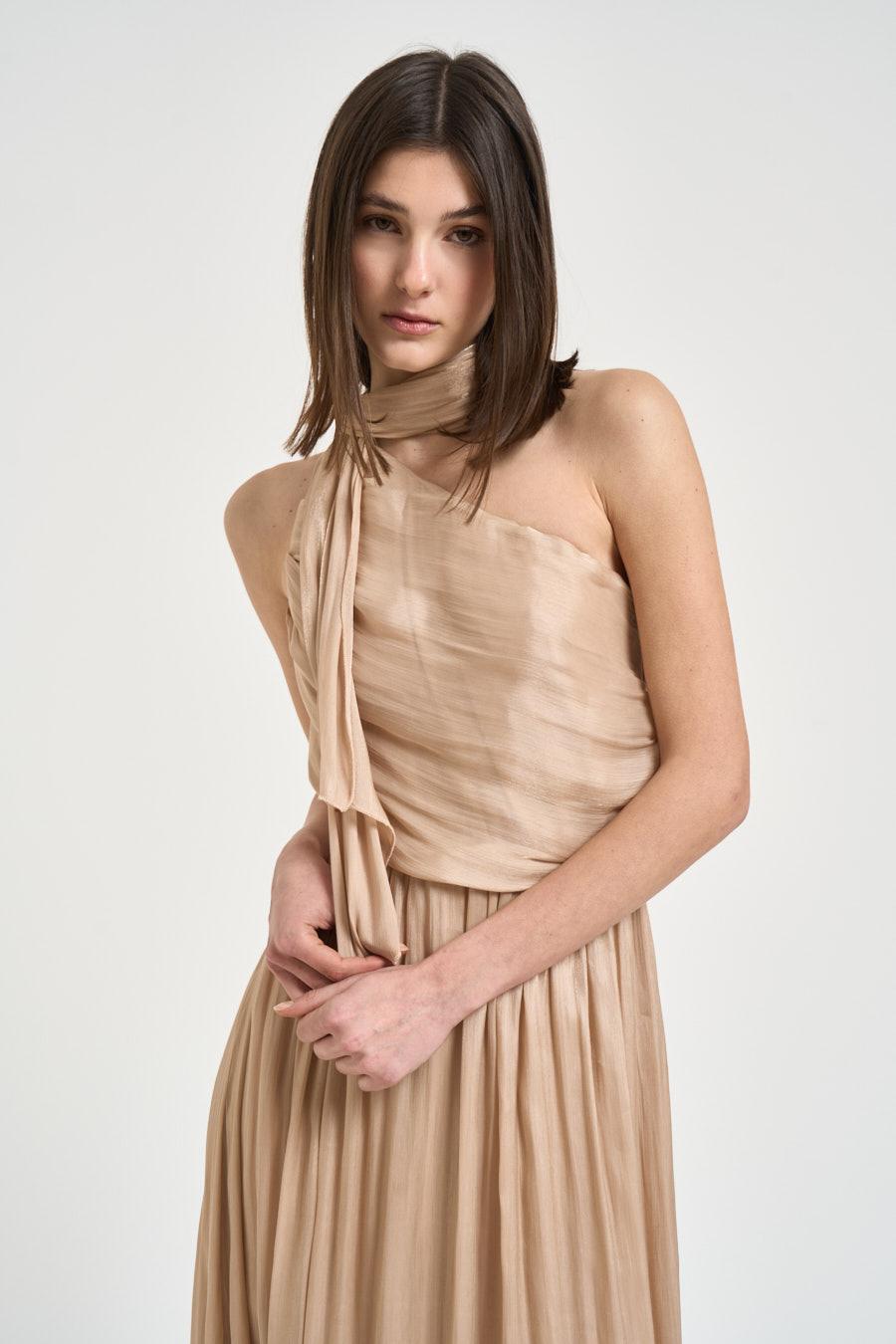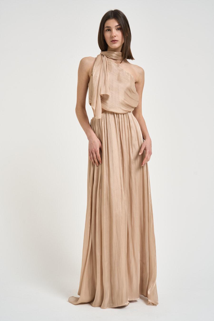 PHILIA LOFT Abito donna lungo champagne. Modello dalla vestibilità morbida. Scollo halter e collo drappeggiato che scende morbido. Punto vita elasticizzato. Gonna lunga. Schiena scoperta con dettaglio cut-out e fusciacca posteriore. Composizione: 100% poliestere. La modella è alta 176 cm e indossa la taglia XS.