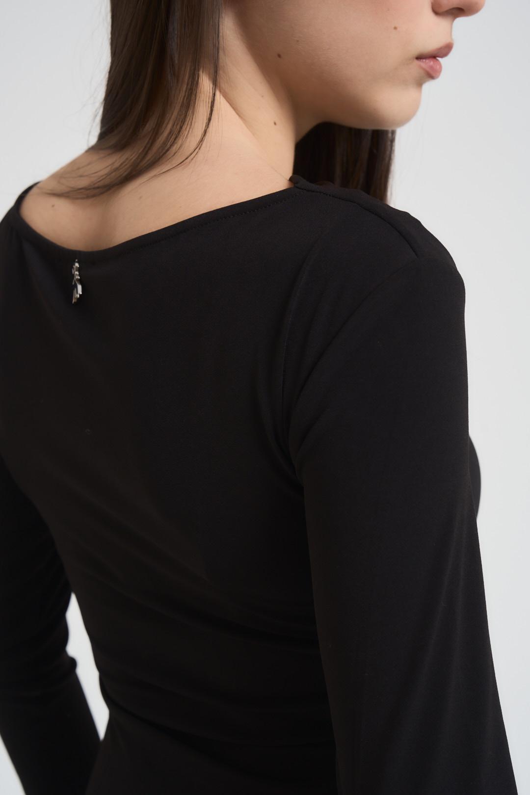 PATRIZIA PEPE Abito donna lungo con spacco nero. Modello con drappeggio in vita. Spacco laterale. Scollo a barchetta. Manica lunga. Iconico stemma logo posto sul retro. Composizione: 95% poliestere, 5% elastane. La modella è alta 172 cm e indossa la taglia S.