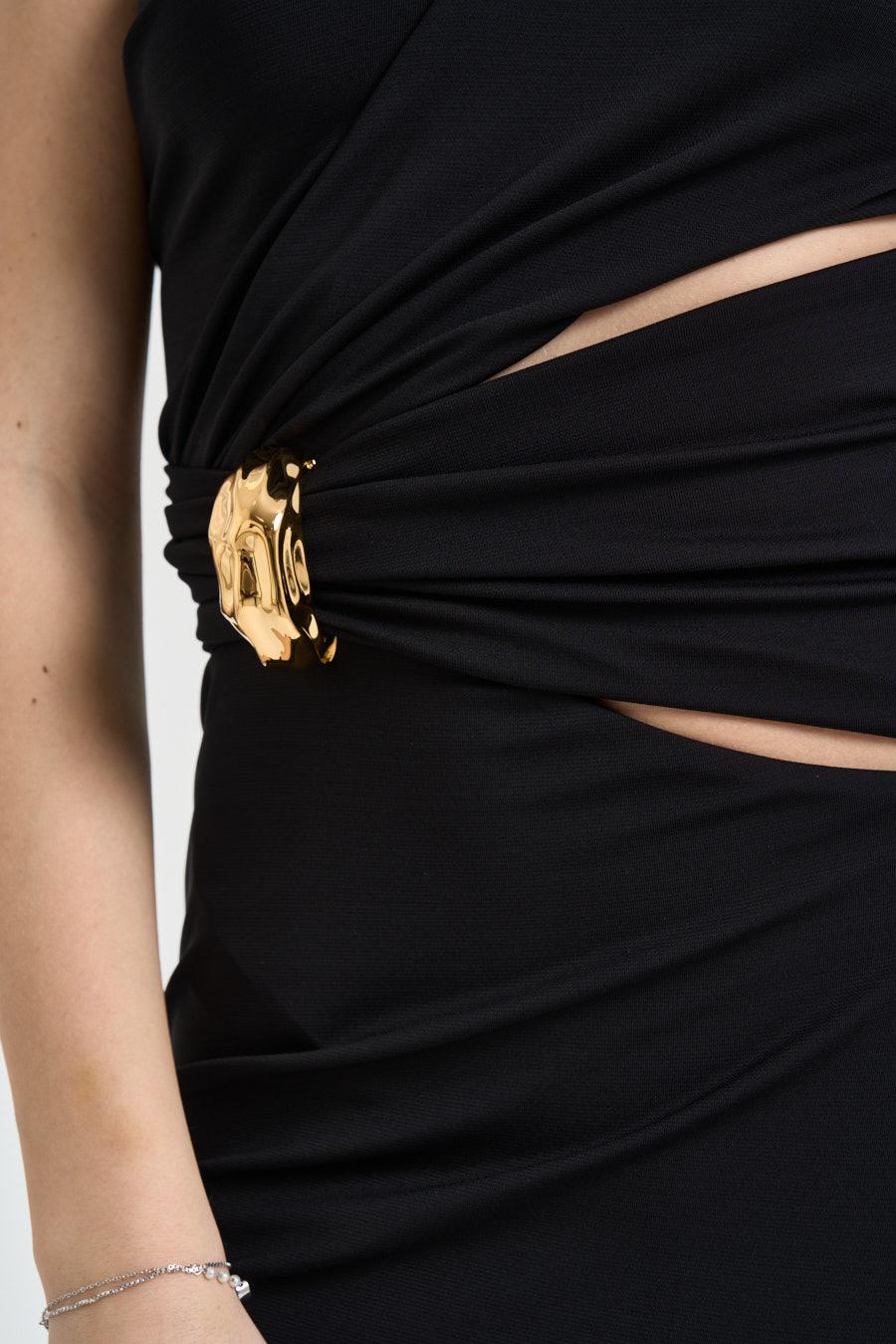 ELISABETTA FRANCHI Abito donna lungo cut out nero. Modello lungo monospalla con manica lunga, caratterizzato da cut-out frontali che valorizzano la silhouette. Dettaglio gioiello in vita con logo dorato, elemento distintivo e luminoso. Composizione: elastane e viscosa. La modella è alta 172cm e indossa la taglia 40.