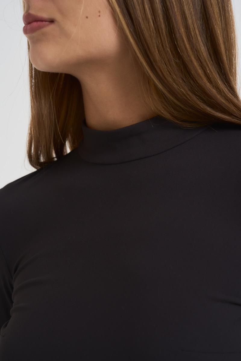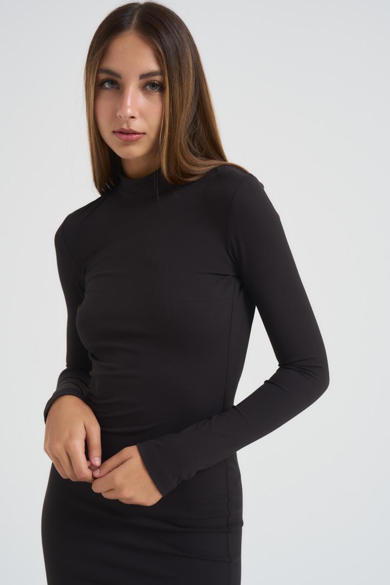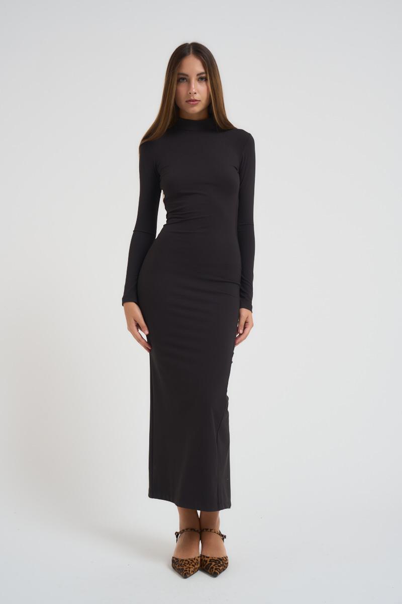 SILENCE Abito donna lungo nero. Modello slim fit con apertura sulla schiena e spacco sul retro, collo alto e chiusura con zip nascosta. Composizione: viscosa e poliestere. La modella è alta 176cm e indossa la taglia S.