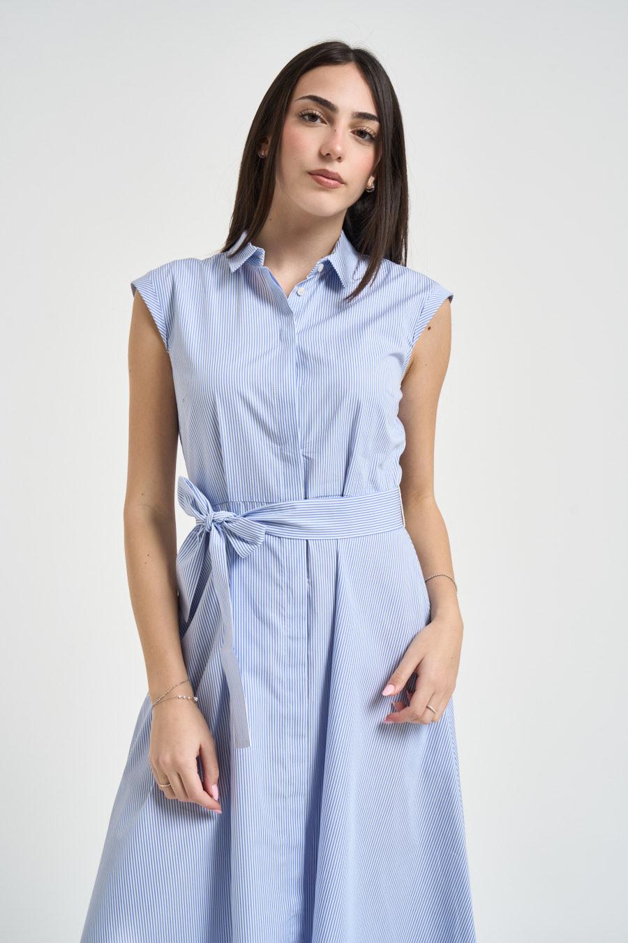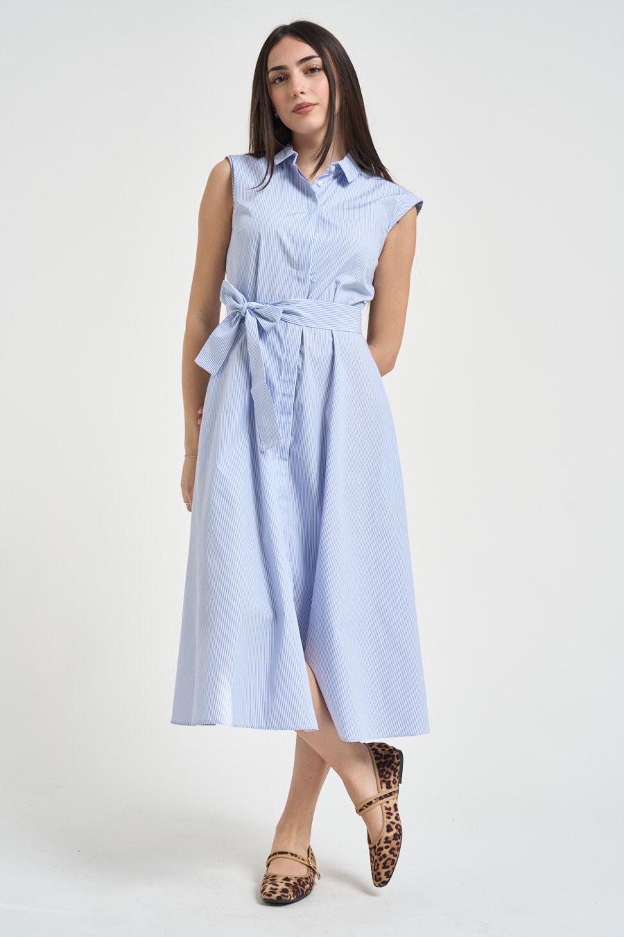 EMME Abito donna midi chemisier a righe. Modello in tessuto leggero con righe azzurre e bianche, colletto classico e chiusura frontale con bottoni, caratterizzato da linea svasata e cintura coordinata in vita da annodare che valorizza la silhouette. Composizione: tessuto misto cotone. La modella è alta 172cm e indossa la taglia 40.