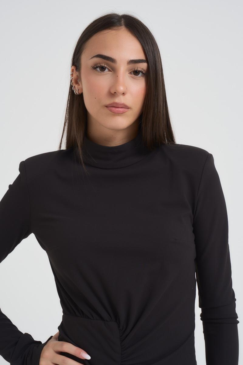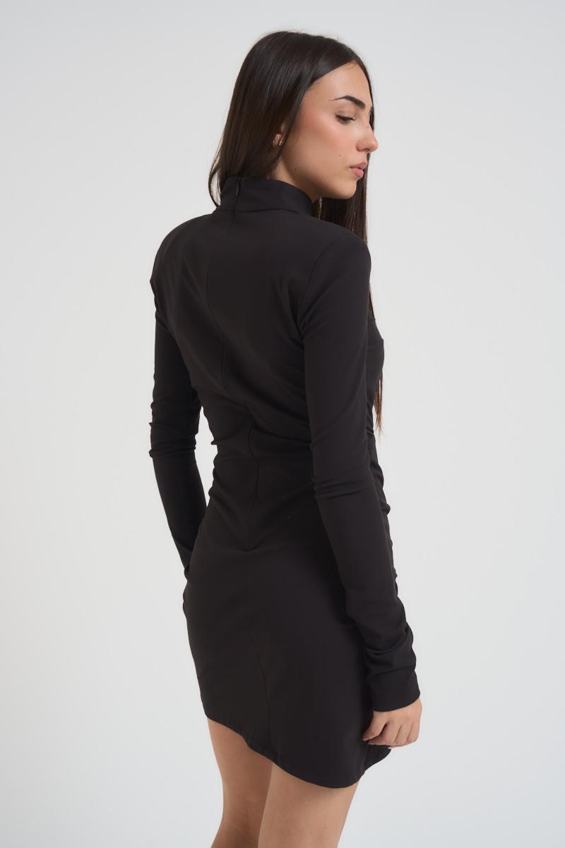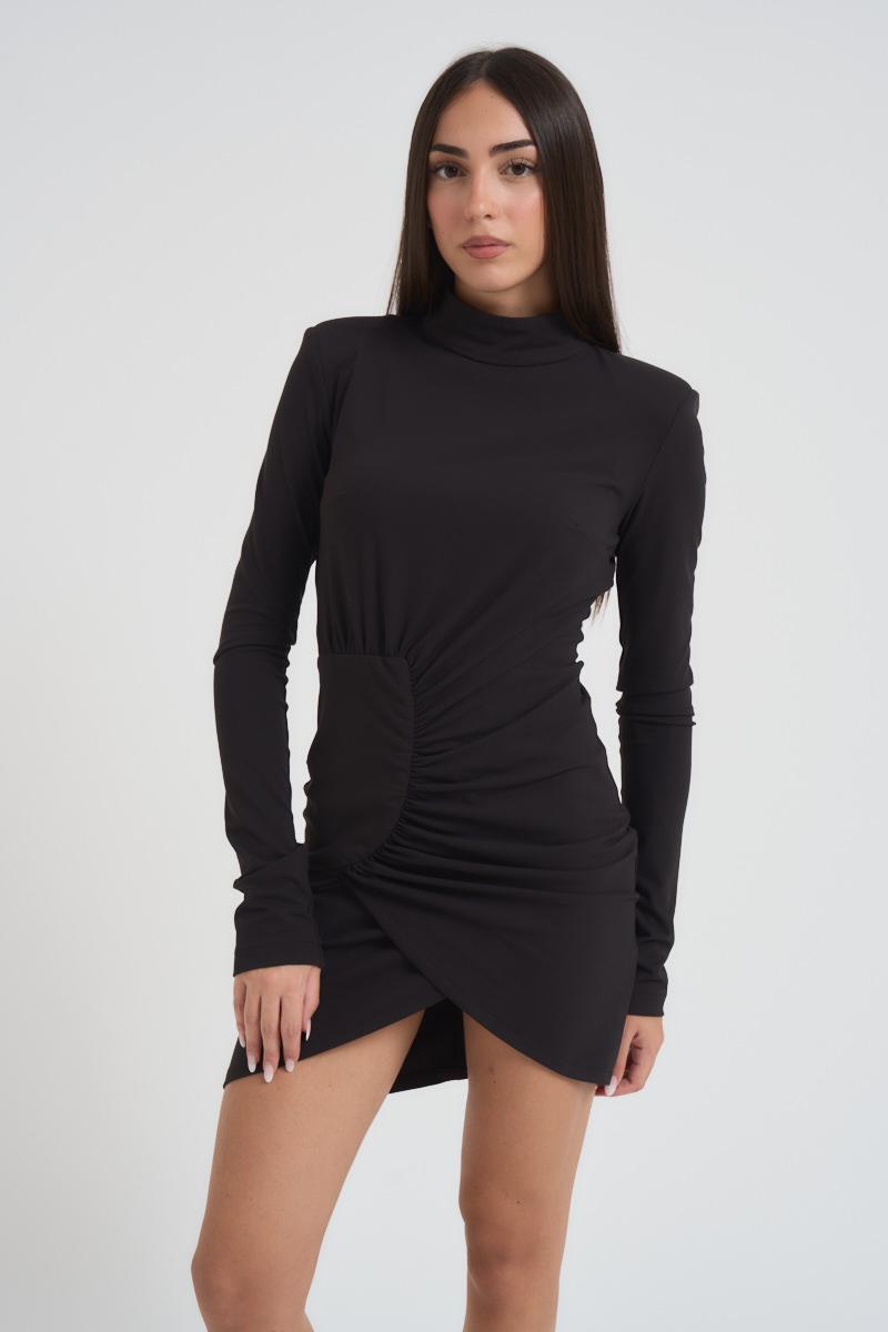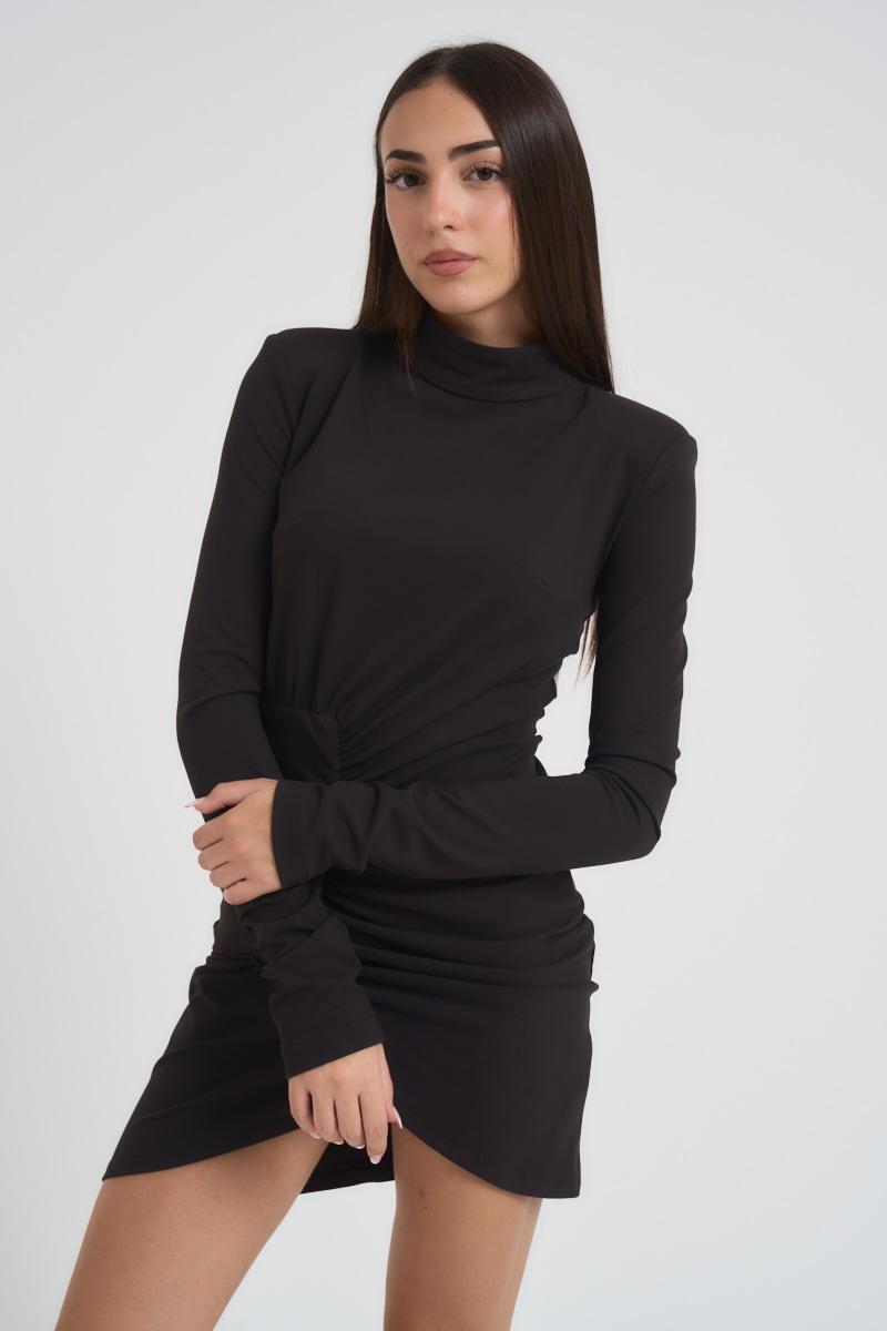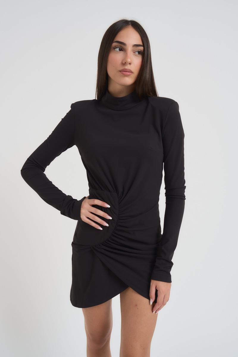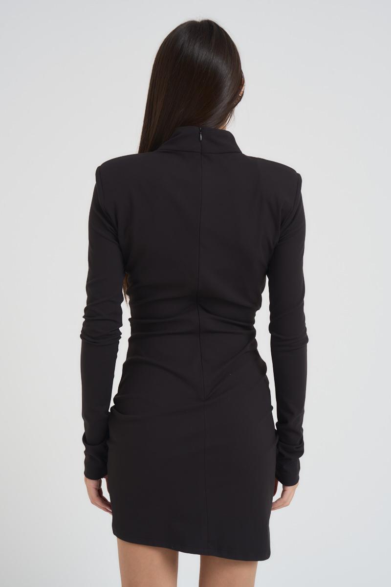 SILENCE Abito donna mini nero. Modello con collo alto e manica lunga, slim fit. Arricciatura centrale e spalline imbottite. Chiusura con zip sul retro. Composizione: vicosa e poliestere. La modella è alta 172 cm e indossa la taglia S.