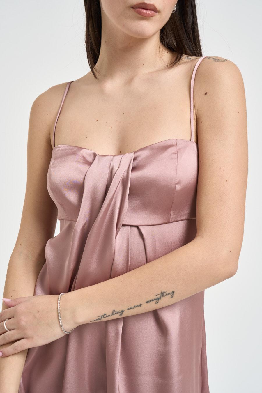 EMME Abito lungo donna rosa cipria in raso fluido. Modello con spalline sottili e scollo dritto, impreziosito da delicato drappeggio frontale che dona movimento e raffinatezza. Linea morbida e scivolata che accarezza la silhouette, con spacco laterale che valorizza la figura e aggiunge un tocco sensuale ed elegante. Chiusura posteriore con zip invisibile e struttura pulita sul retro. Design sofisticato e femminile, ideale per cerimonie ed eventi speciali. Composizione: 100%poliestere. La modella è alta 172cm e indossa la taglia 40.