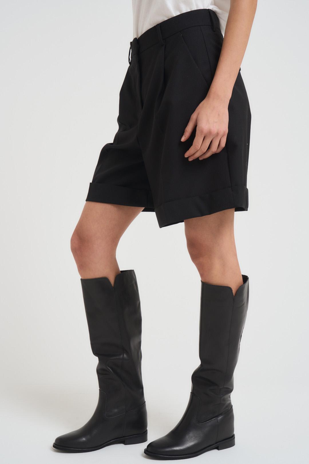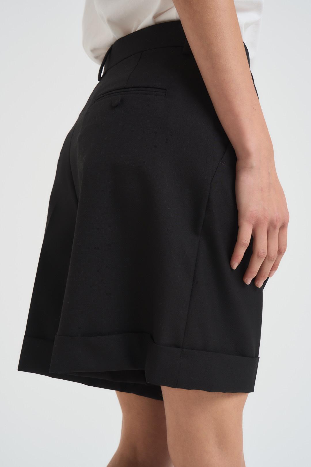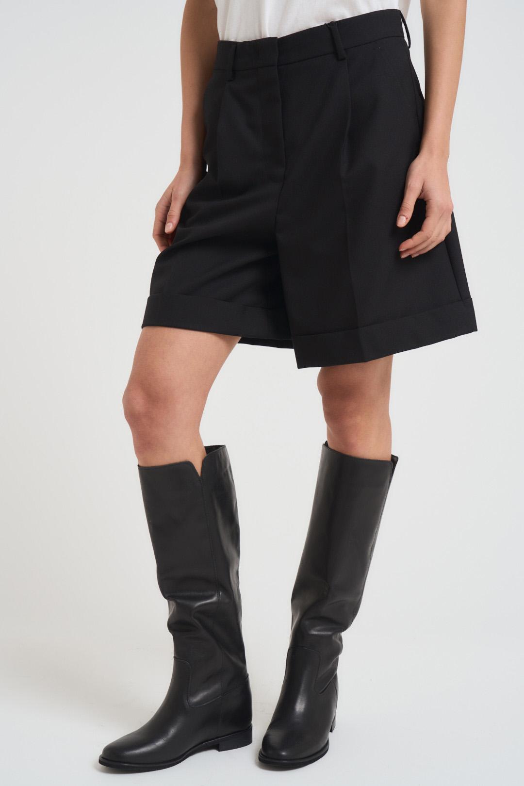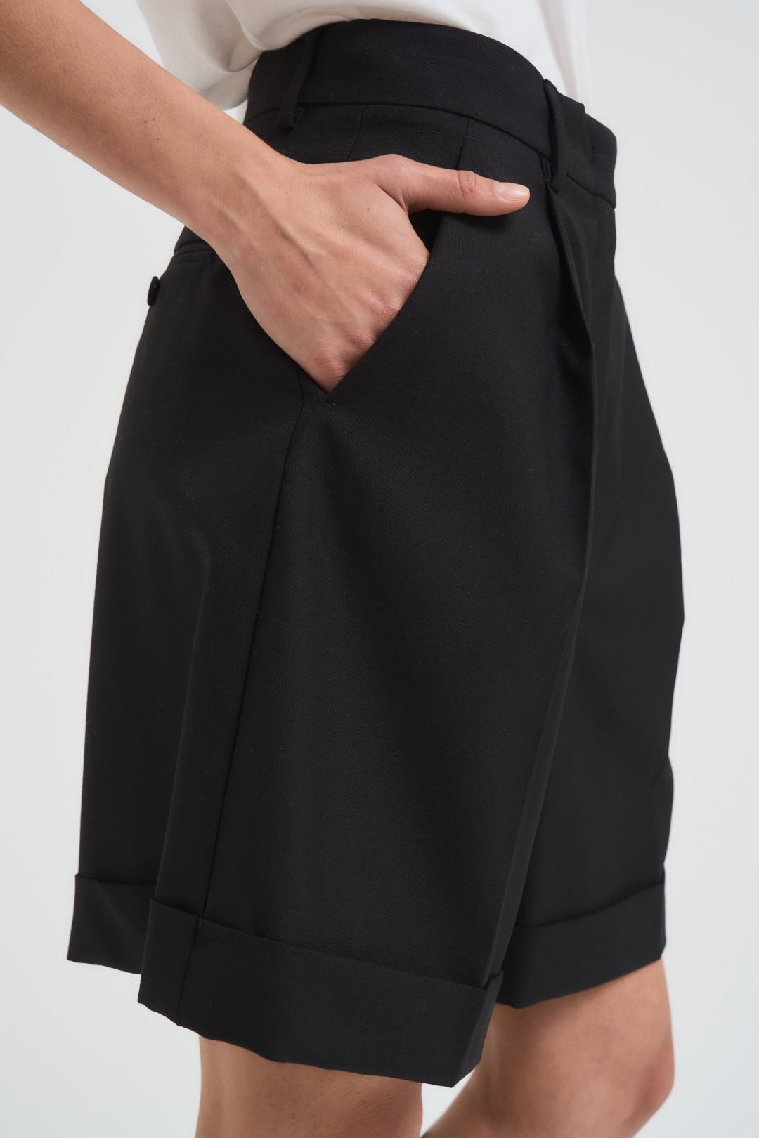 MAX MARA WEEKEND Bermuda donna con risvolto nero. Modello vita alta e passanti per cintura. Chiusura con zip con patta e gancetto. Tasche alla francese sui fianchi. Tasche a filetto con bottone sul retro. Piega stirata. Composizione: 100% lana. La modella è alta 176cm e indossa la taglia 40.