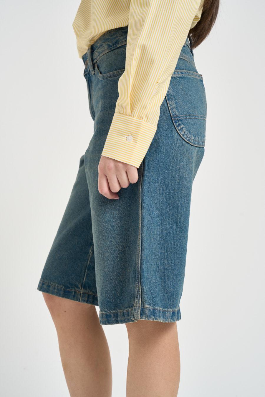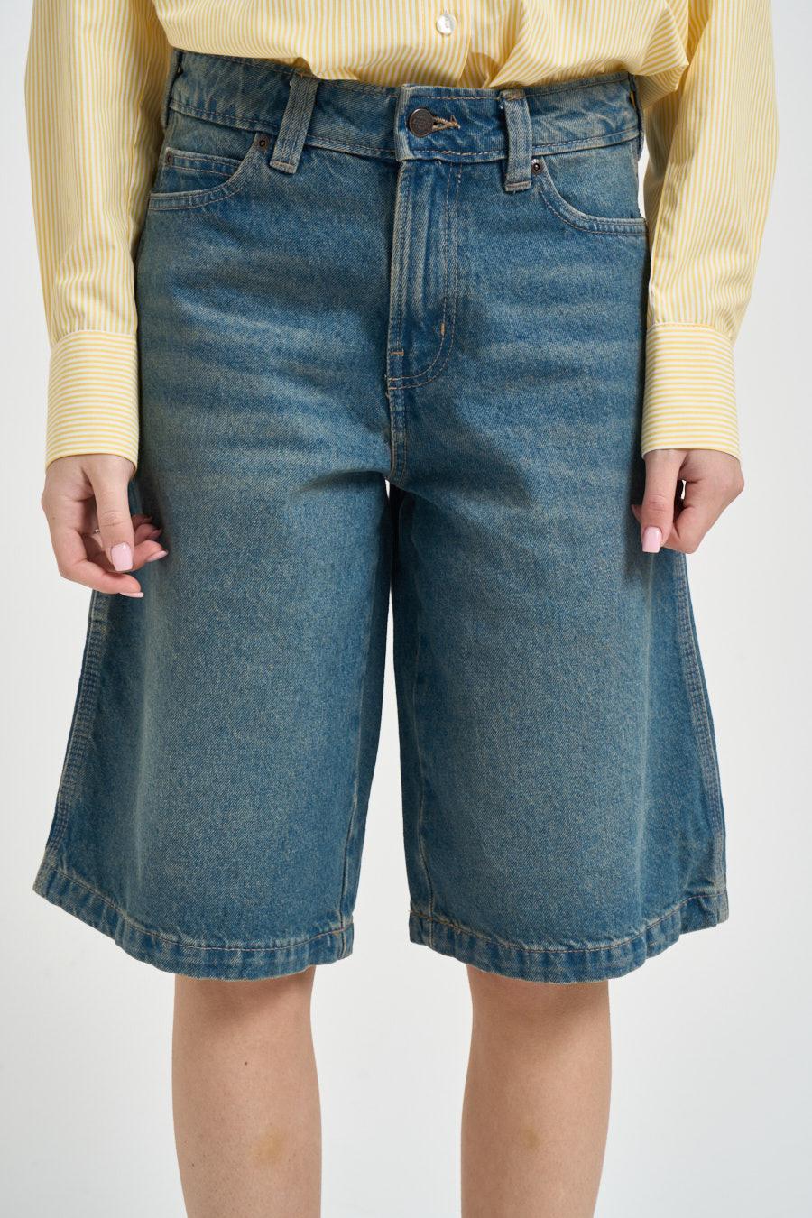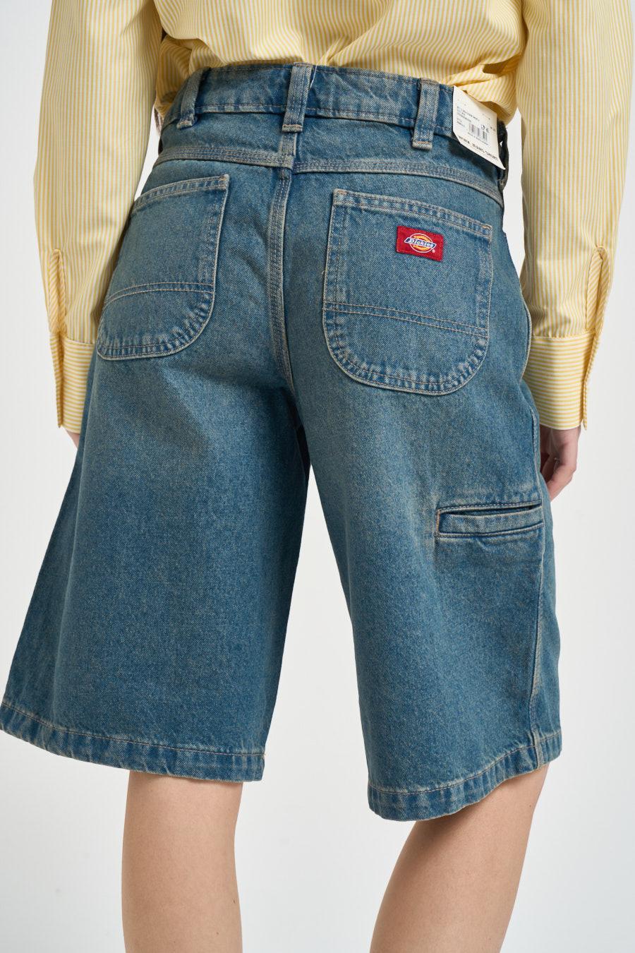 DICKIES Bermuda donna in denim. Modello con chiusura frontale con cerniera e bottone. Passanti in vita. Cinque tasche. Composizione: 100% cotone. La modella è alta 172 cm e indossa la taglia 25.