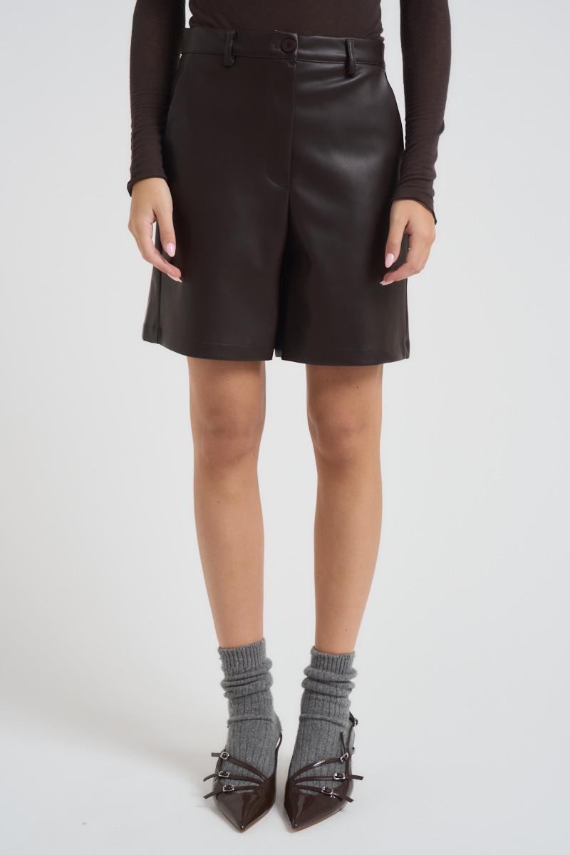 DIXIE Bermuda donna moro. Modello sopra il ginocchio, due tasche frontali, chiusura con zip e bottone. Composizione: 100% ecopelle. La modella è alta 172 cm e indossa la taglia XS.