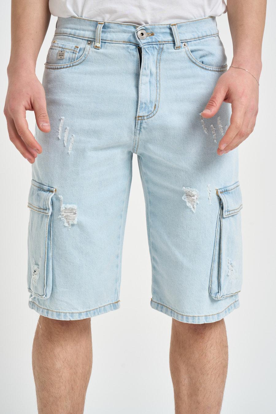 BL11 Bermuda uomo in denim azzurro chiaro. Modello con passanti per cintura, caratterizzato da una vestibilità confortevole. Realizzato in denim lavato, presenta chiusura frontale con bottone e zip. Dotato di tasche laterali e posteriori, è arricchito da tasche cargo applicate sui lati. Sul retro è presente un patch logo applicato in vita e una micro etichetta logo sul davanti. Composizione: 100% cotone. Il modello è alto 190 cm e indossa la taglia 48.