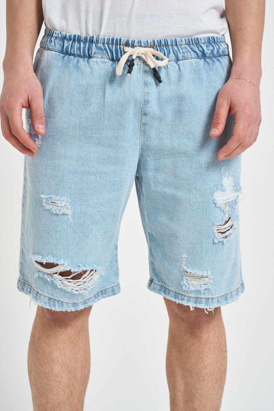 BL11 Bermuda uomo in denim chiaro. Modello con vita elasticizzata e coulisse regolabile, caratterizzato da una vestibilità confortevole. Realizzato in tessuto denim morbido, presenta tasche laterali e tasche posteriori applicate e rotture decorative. Composizione: 100% Poliestere. Il modello è alto 190 cm e indossa la taglia 48.