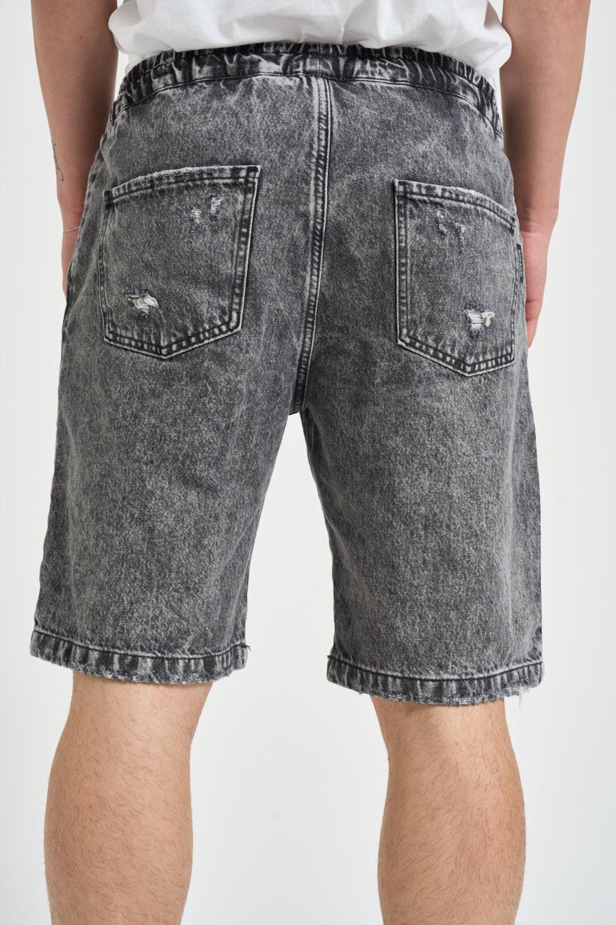 BL11 Bermuda uomo in denim nero. Modello con vita elasticizzata e coulisse regolabile, caratterizzato da una vestibilità confortevole. Realizzato in tessuto denim morbido, presenta tasche laterali e tasche posteriori applicate e rotture decorative. Composizione: 100% Poliestere. Il modello è alto 190 cm e indossa la taglia 48.