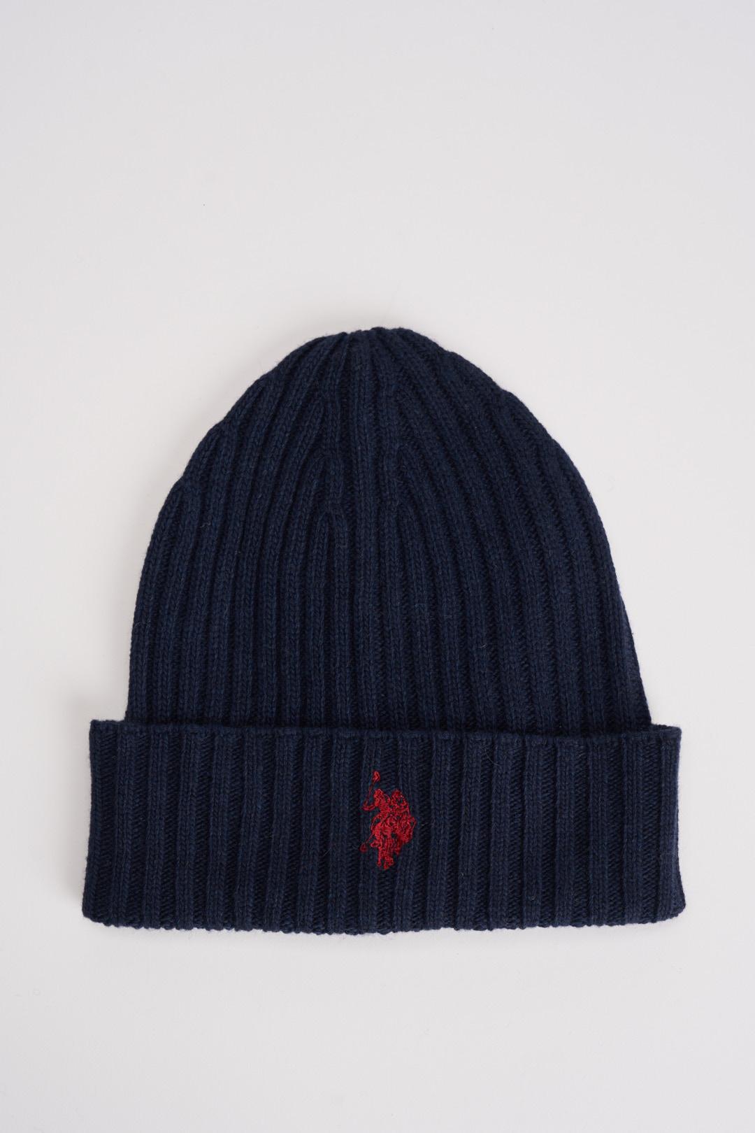 US POLO Berretto uomo blu notte. Lavorazione a costine. Logo brand ricamato rosso. Composizione: 40% Lana, 30% Viscosa, 20% Nylon, 10% Cashmere.