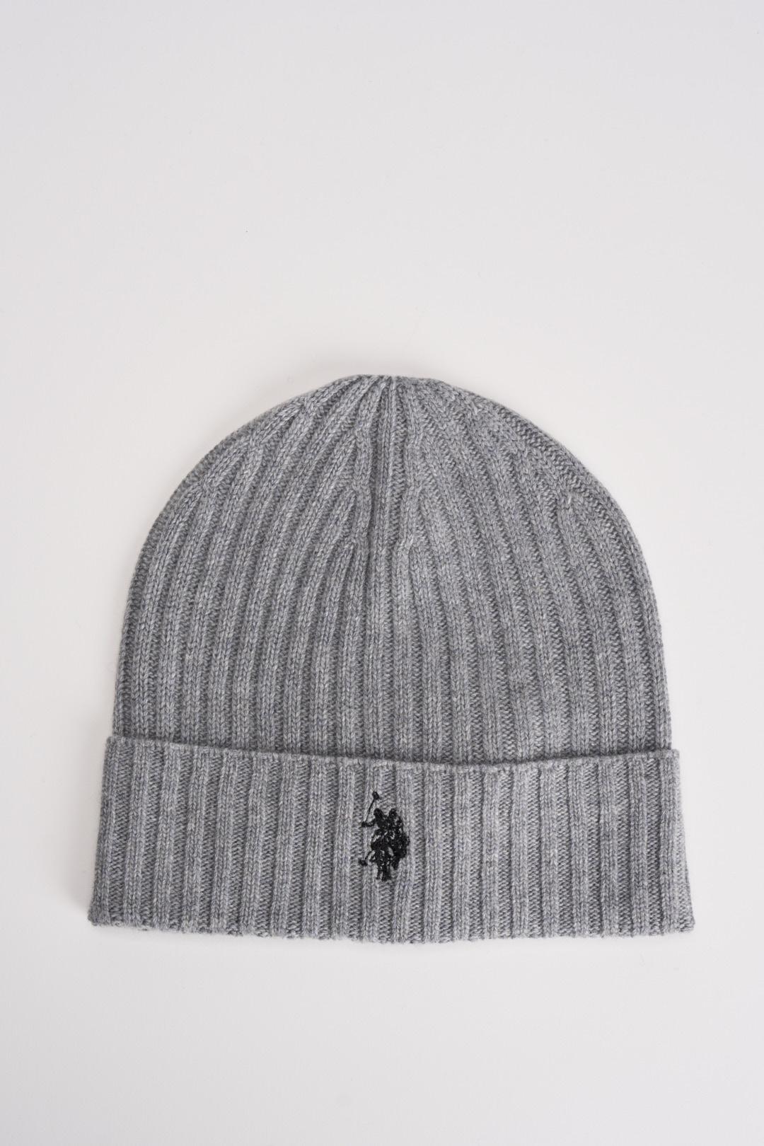 US POLO Berretto uomo grigio chiaro. Lavorazione a costine. Logo brand ricamato blu. Composizione: 40% Lana, 30% Viscosa, 20% Nylon, 10% Cashmere.