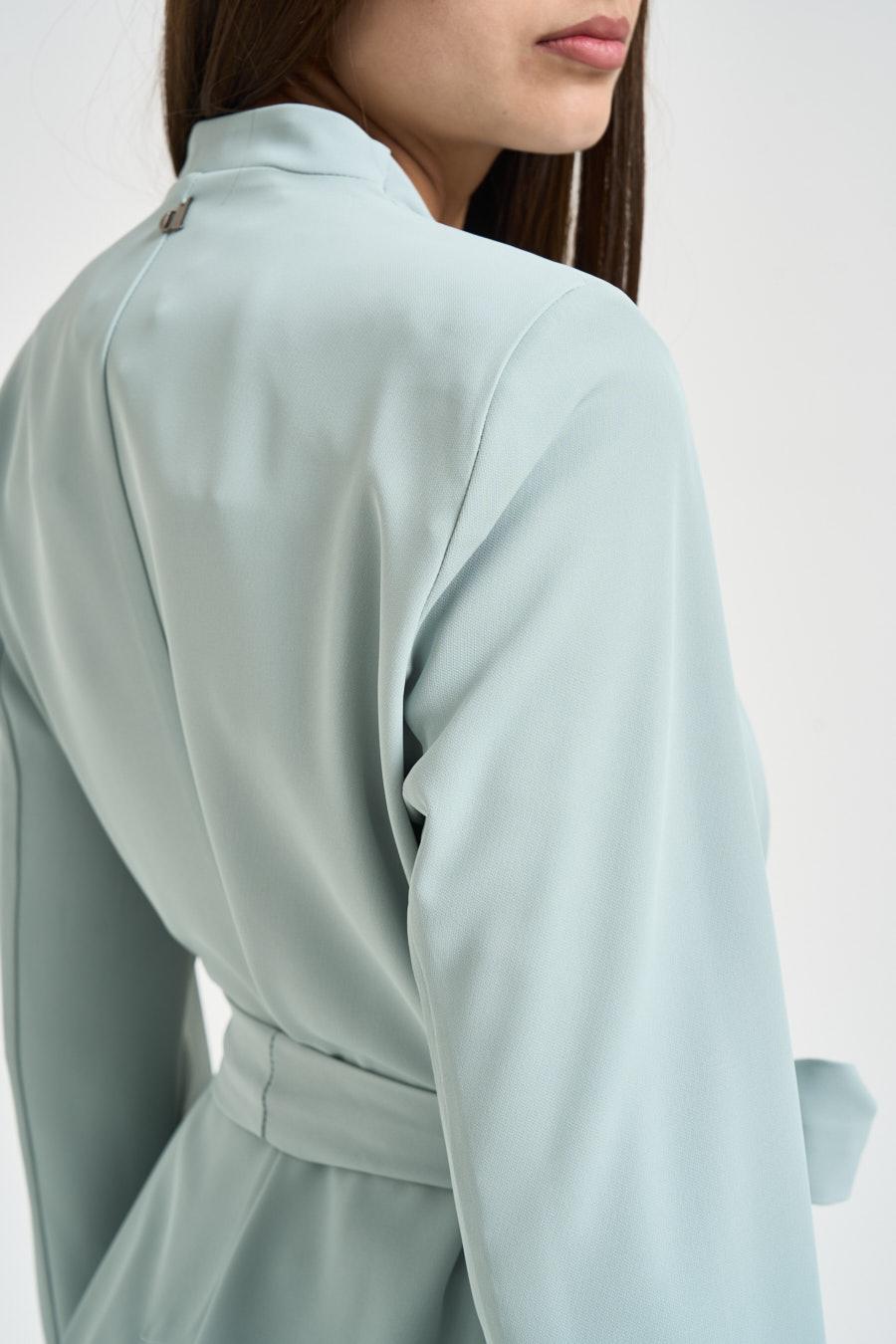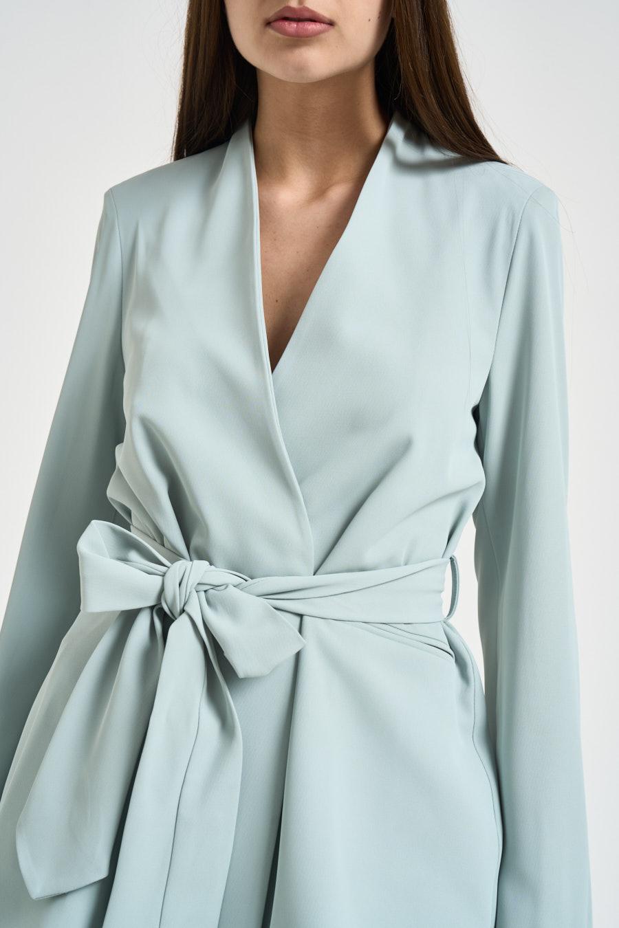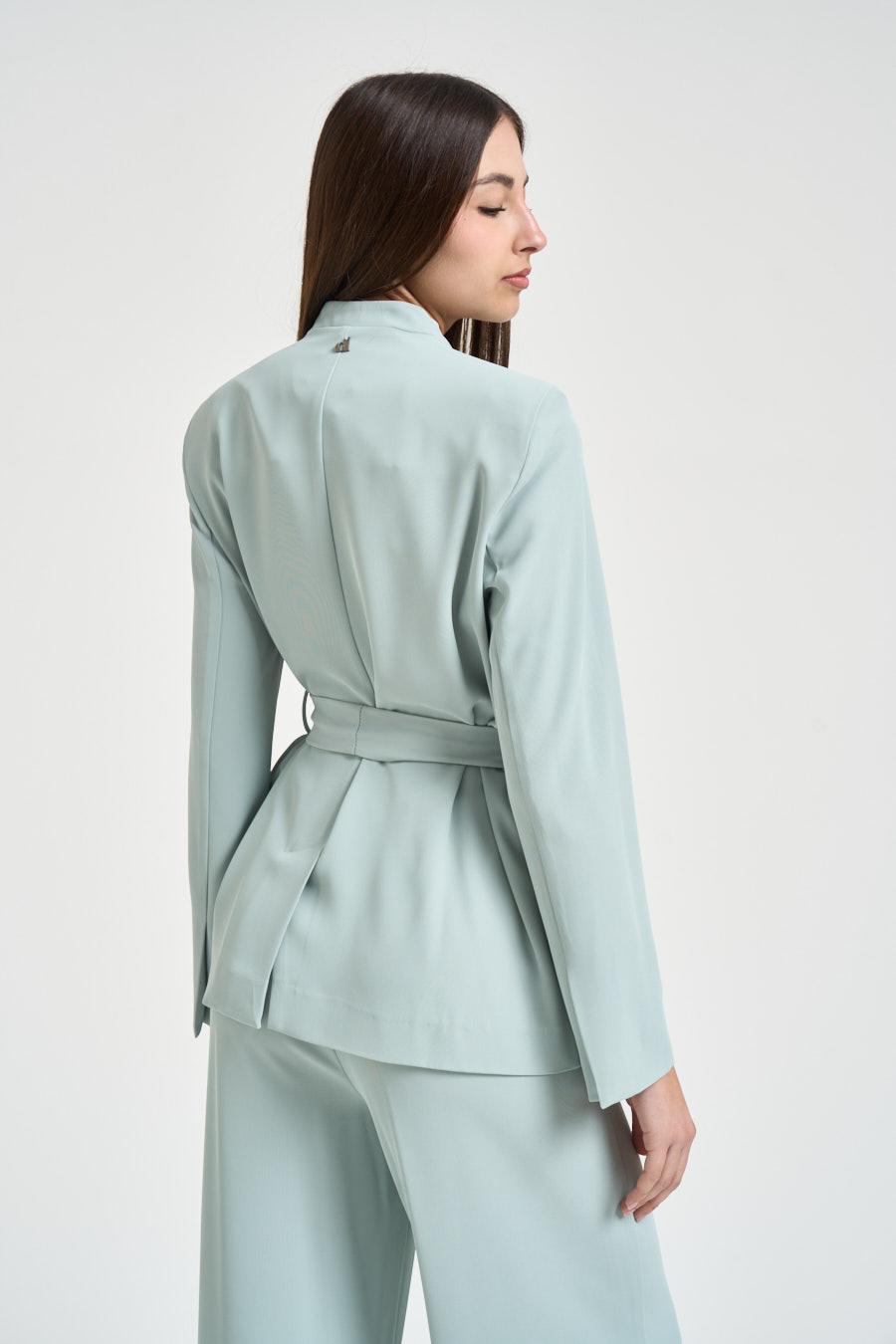 DIXIE Blazer donna con fusciacca celeste. Modello senza collo, chiusura con fuscciaccia intorno alla vita., due tasche a filetto laterali e apertura sul retro. Perfetta abbinata al suo pantalone. Composizione: 96%poliestere 4%elastane. La modella è alta 176cm e indossa la taglia S.