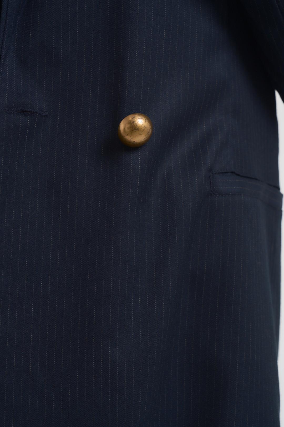 INCLOTH Blazer donna gessato blu. Modello con chiusura a doppiopetto. Spilla removibile sul rever. Due tasche a filetto. Logo brand sul retro. Composizione: 64% poliestere, 34% viscosa, 2% elastane La modella è alta 176 cm e indossa la taglia S.