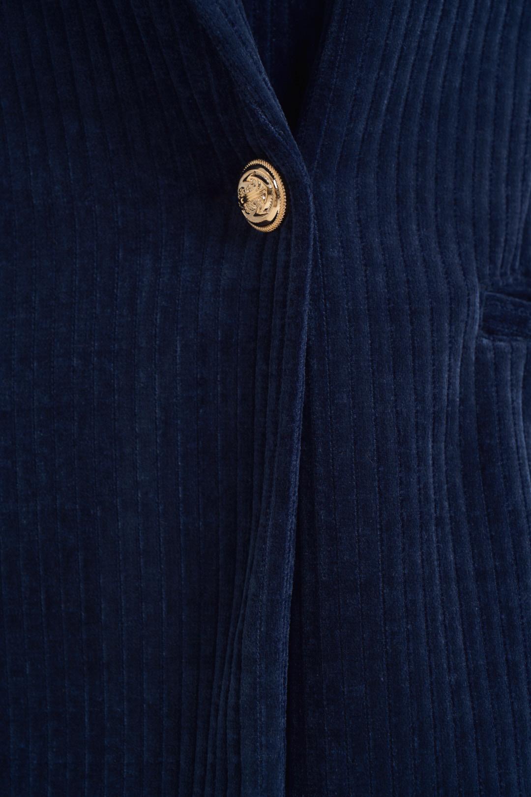 INCLOTH Giacca donna in velluto a coste blu. Modello con chiusura a doppiopetto. Spilla removibile sul rever. Due tasche a filetto. Logo brand sul retro. Composizione: 98% poliestere, 2% elastane. La modella è alta 176 cm e indossa la taglia S.