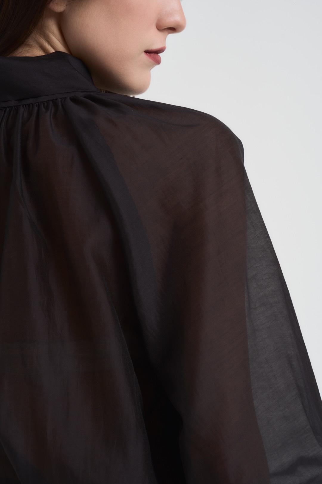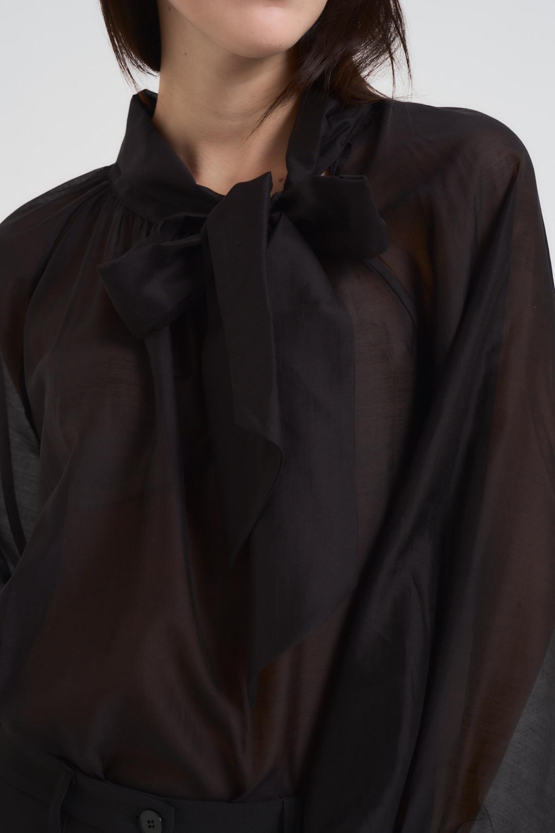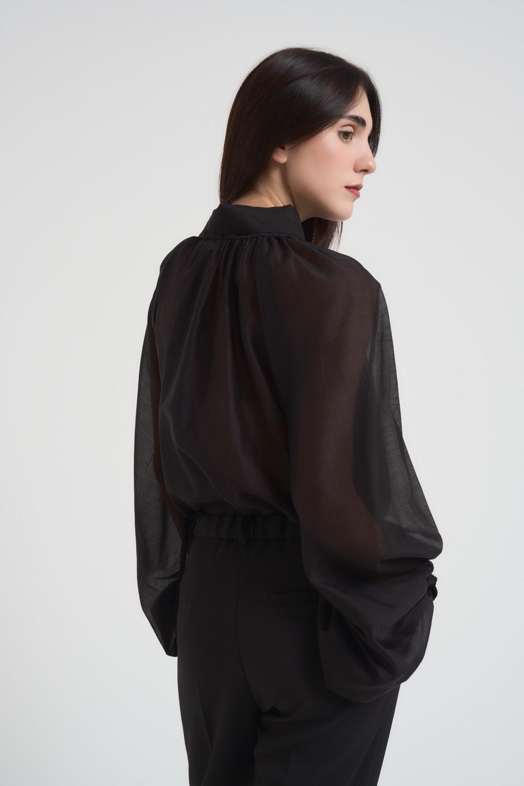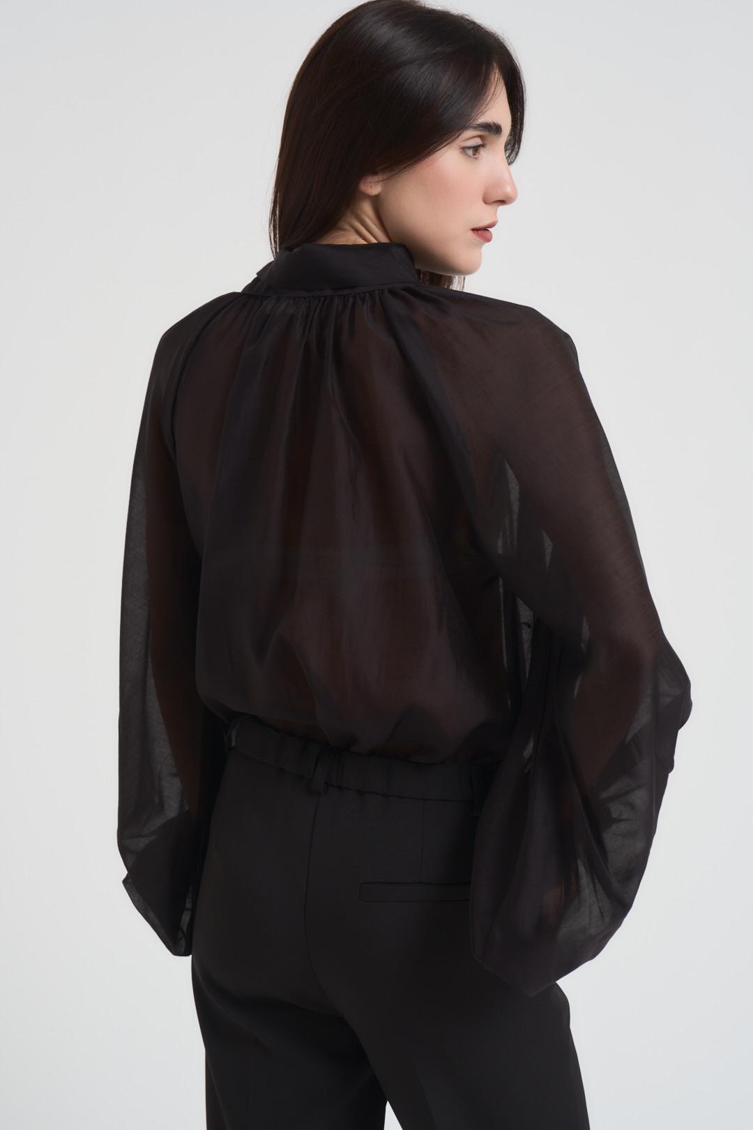VICOLO Blusa donna con fiocco nera. Modello effetto organza con maniche balloon e polsino alto. Composizione: 86% Lyocell 15% Poliestere. La modella è alta 175 cm e indossa la taglia S.