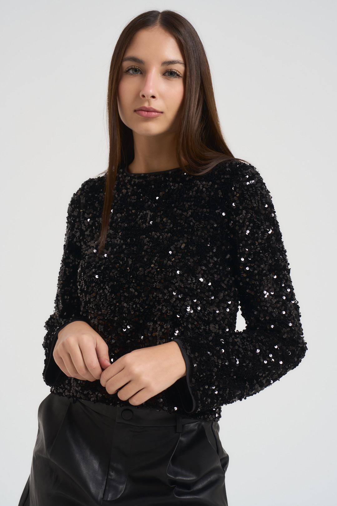 ONLY Blusa donna con paillettes nera. Modello chiusura con fiocco sul retro. Manica lunga. Girocollo. Composizione: 95% Poliestere 5% Elastan. La modella è alta 176 cm e indossa la taglia S.