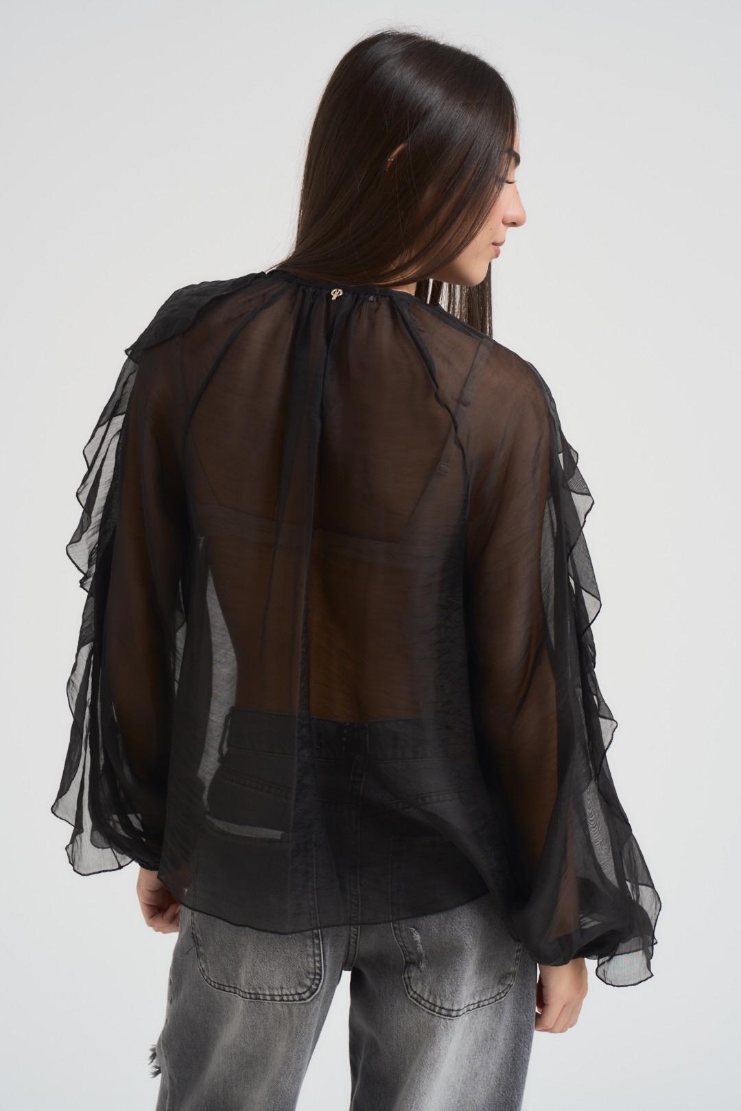 PHILIA Blusa donna con volant nera. Modello a manica lunga, elastico sul polsino, apertura frontale con chiusura con laccetto. Composizione: 85% Lyocell 15% Poliammide. La modella è alta 172 cm e indossa la taglia S.