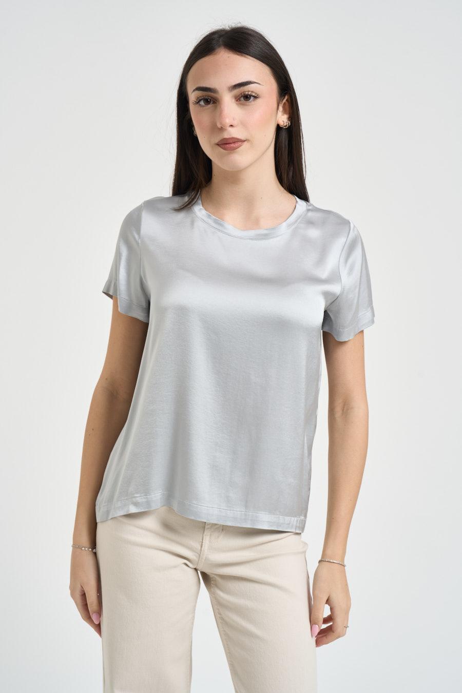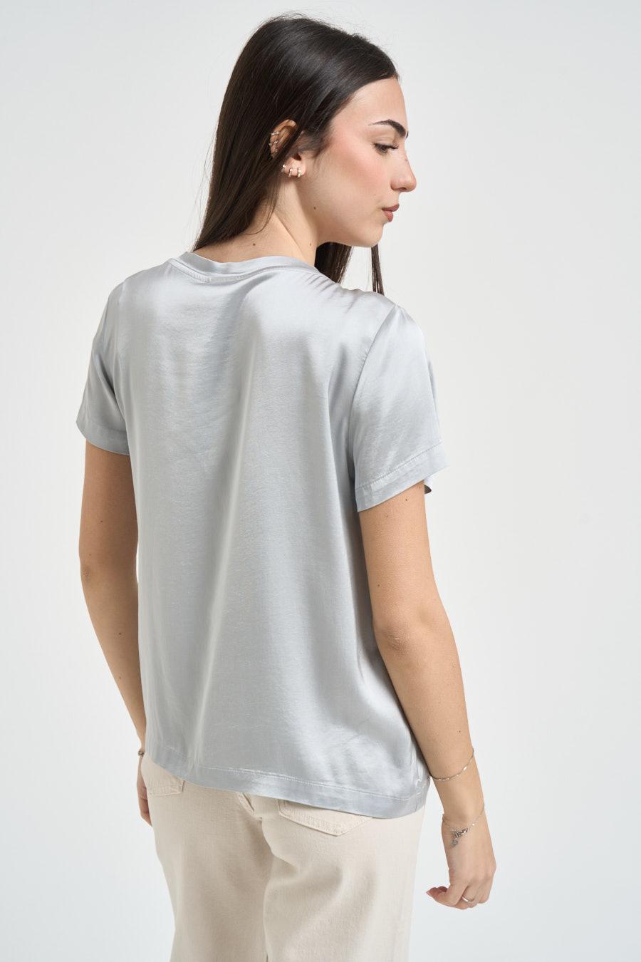 VICOLO Blusa donna satinata argento. Modello dalla vestibilità morbida. Girocollo. Manica corta. Composizione: 97% viscosa, 3% elastane. La modella è alta 172 cm e indossa la taglia S.
