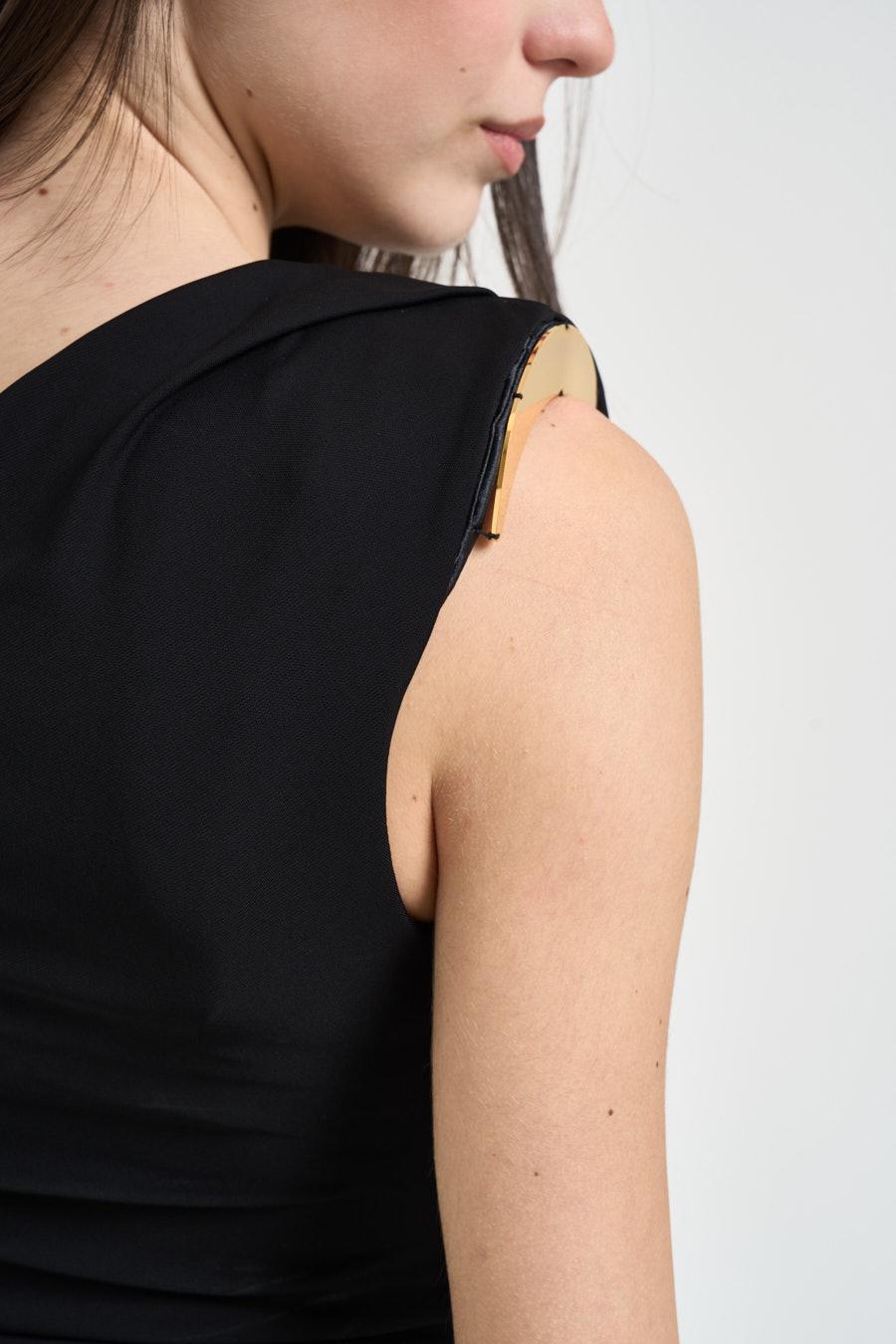 ELISABETTA FRANCHI Body donna con gioiello nero. Modello smanicato. Gioiello su spalla con logo. Drappeggiato. Composizione: 95% viscosa, 5% elastane. La modella è alta 172 cm e indossa la taglia 40.