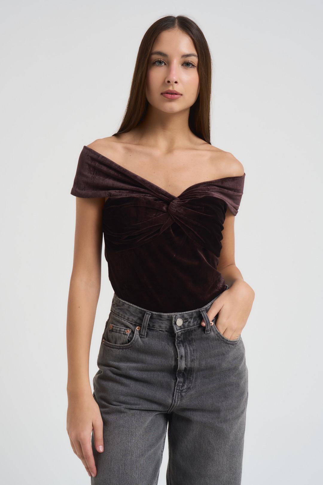 GRACE AND MILA Body donna con scollo a V marrone. Modello con ampia scollatura. Manica corta. Composizione: 90 % poliestere, 10 % elastan. La modella è alta 176 cm e indossa la taglia S.