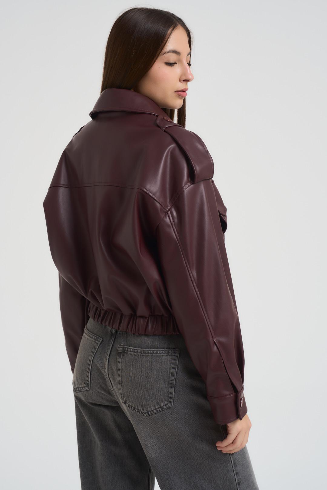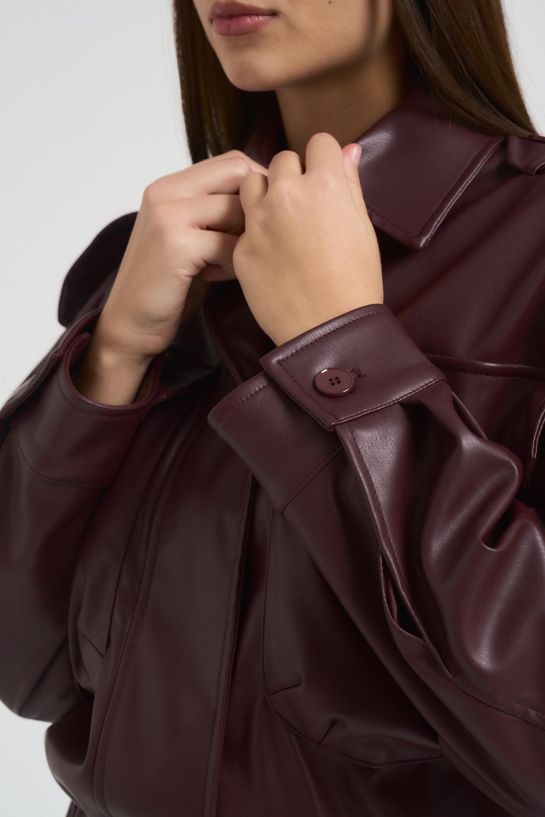 VICOLO Bomber corto donna in ecopelle bordeaux. Modello corto con spalle leggermente scese. Chiusura con zip frontale tasche a pattina sul petto e dettagli in metallo. Polsini e fondo regolabili con bottoni a pressione. Taglio corto e fit oversize. Composizione: 55% Poliestere 45% Poliuretano. La modella è alta 175 cm e indossa la taglia S.