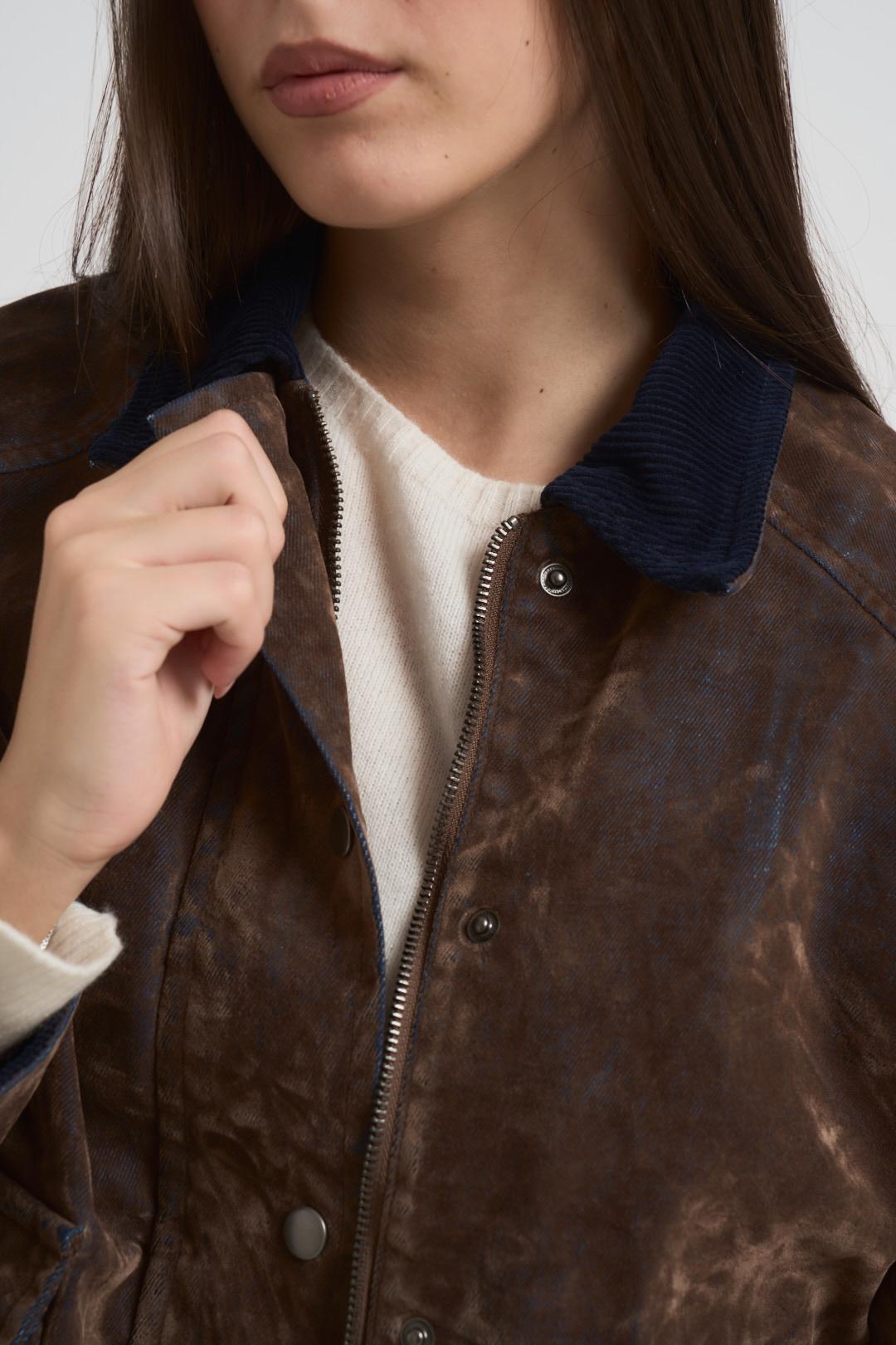 VICOLO Bomber donna con floccatura marrone. Modello con colletto in velluto e tasconi applicati con patta. Doppia chiusura con zip e automatici, velluto spalmato. Regular fit. Composizione: 100%cotone. La modella è alta 172 cm e indossa la taglia S.