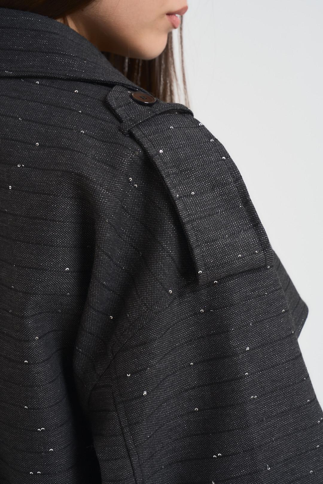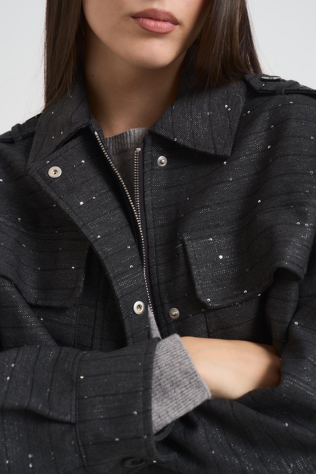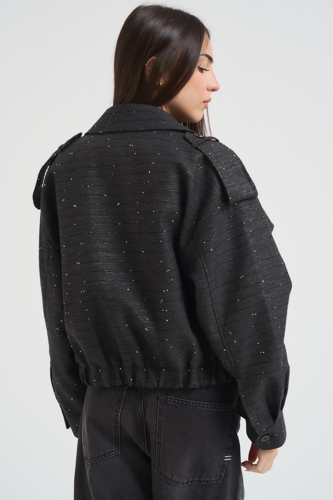 VICOLO Bomber donna lurex antracite. Modello con applicazioni effetto lurex. Elastico in vita. Maniche lunghe con bottone sul polso. Chiusura frontale con zip nascosta e bottoni a pressione. Tasche frontali sul petto. Mostrine sulle spalle. Composizione: 70% Poliestere 15% Viscosa 15% Lana. La modella è alta 172 cm e indossa la taglia S.