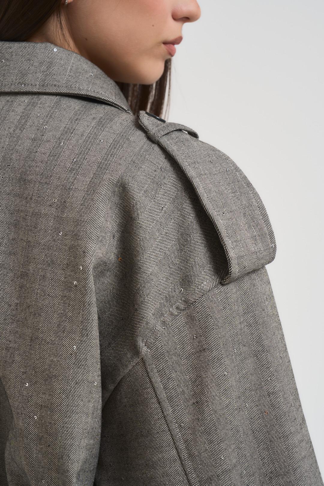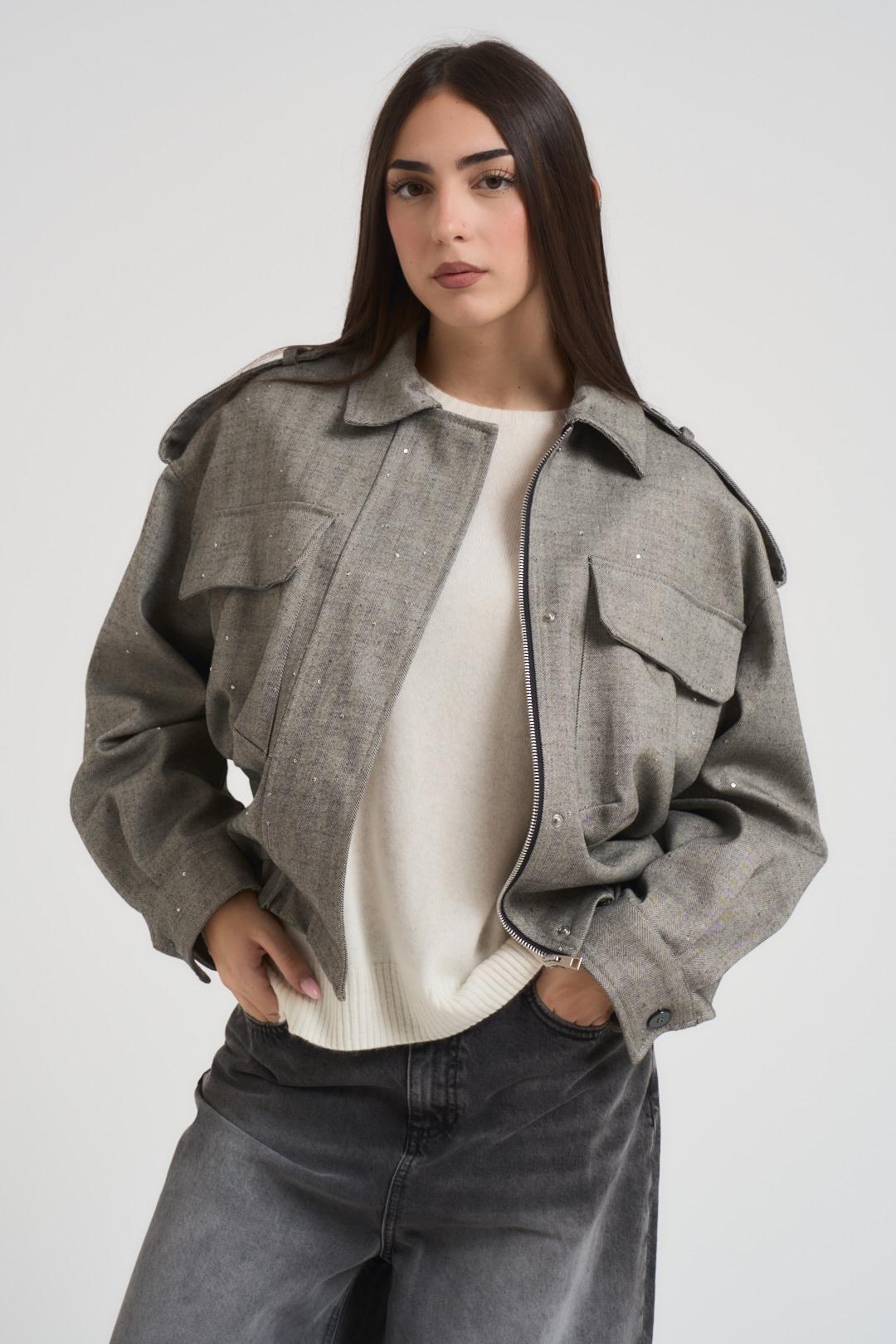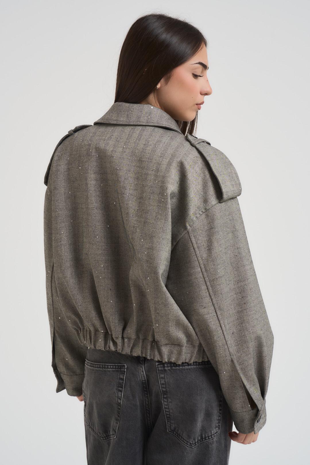VICOLO Bomber paillettes donna grigio spinato. Modello con elastico in vita, maniche lunghe con bottoni sul fondo, chiusura frontale con zip nascosta e bottoni a pressione, 2 tasche con patta sul petto. Composizione: 65% poliestere 32% viscosa 2% elastan 1% fibre varie. La modella è alta 172 cm e indossa la taglia S.