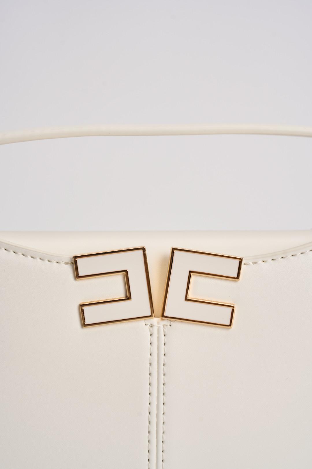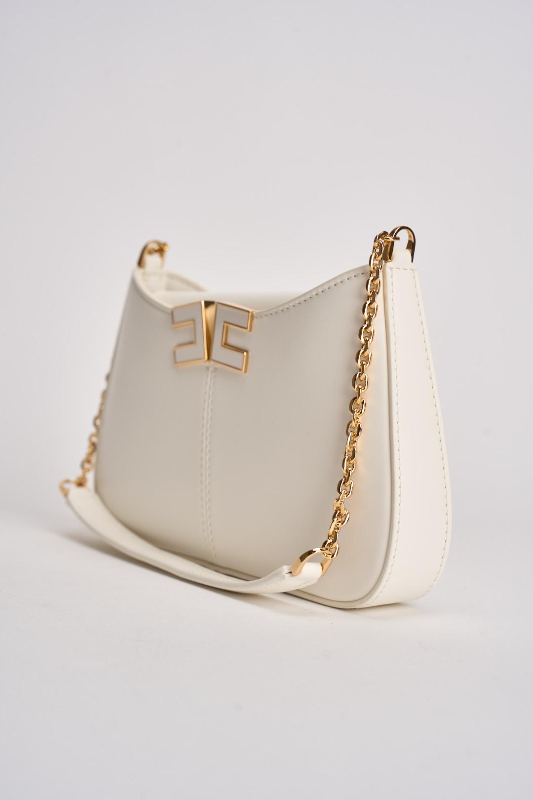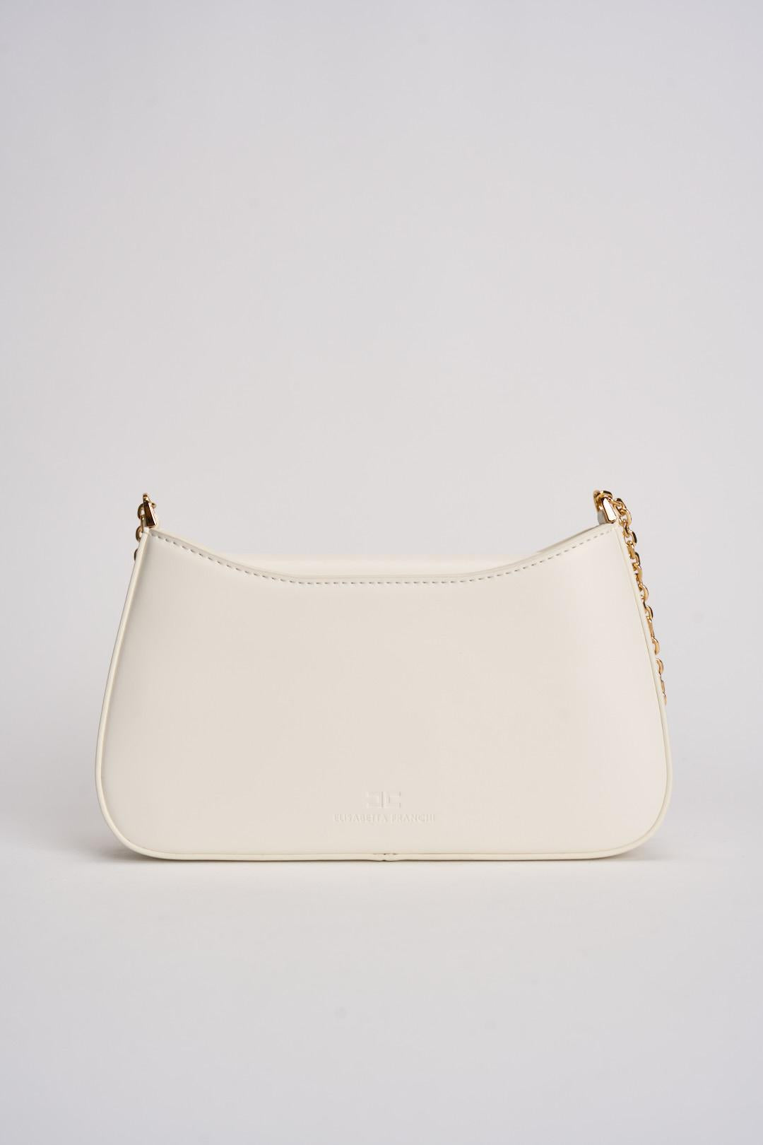 ELISABETTA FRANCHI Borsa donna a spalla avorio. Modello con tracolla in metallo dorato con spallaccio per un maggior comfort. Distintivo taglio a V sul davanti, impreziosito dalliconico logo in metallo dorato e smaltato internamente. Fodera interna. Composizione: 50% Poliuretano, 40% Poliestere, 10% Cotone. Dimensioni: 13,5 x 23 x 3 cm.