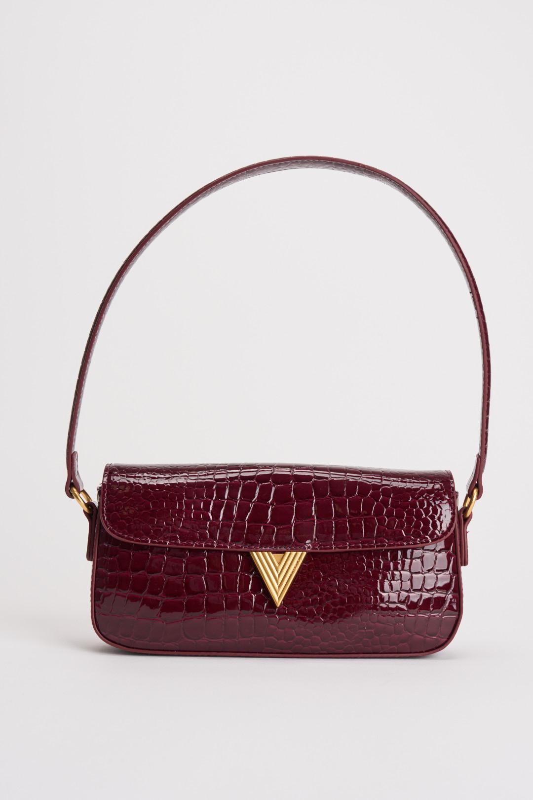 VICOLO Borsa donna a spalla pitonata lucida bordeaux. Modello in ecopelle con tracolla in similpelle rigida, chiusura con bottone logo metal plate Vicolo a pressione con calamita. Tasca interna con zip e taschina. Dimensioni: 24x4,5 x12,5cm.