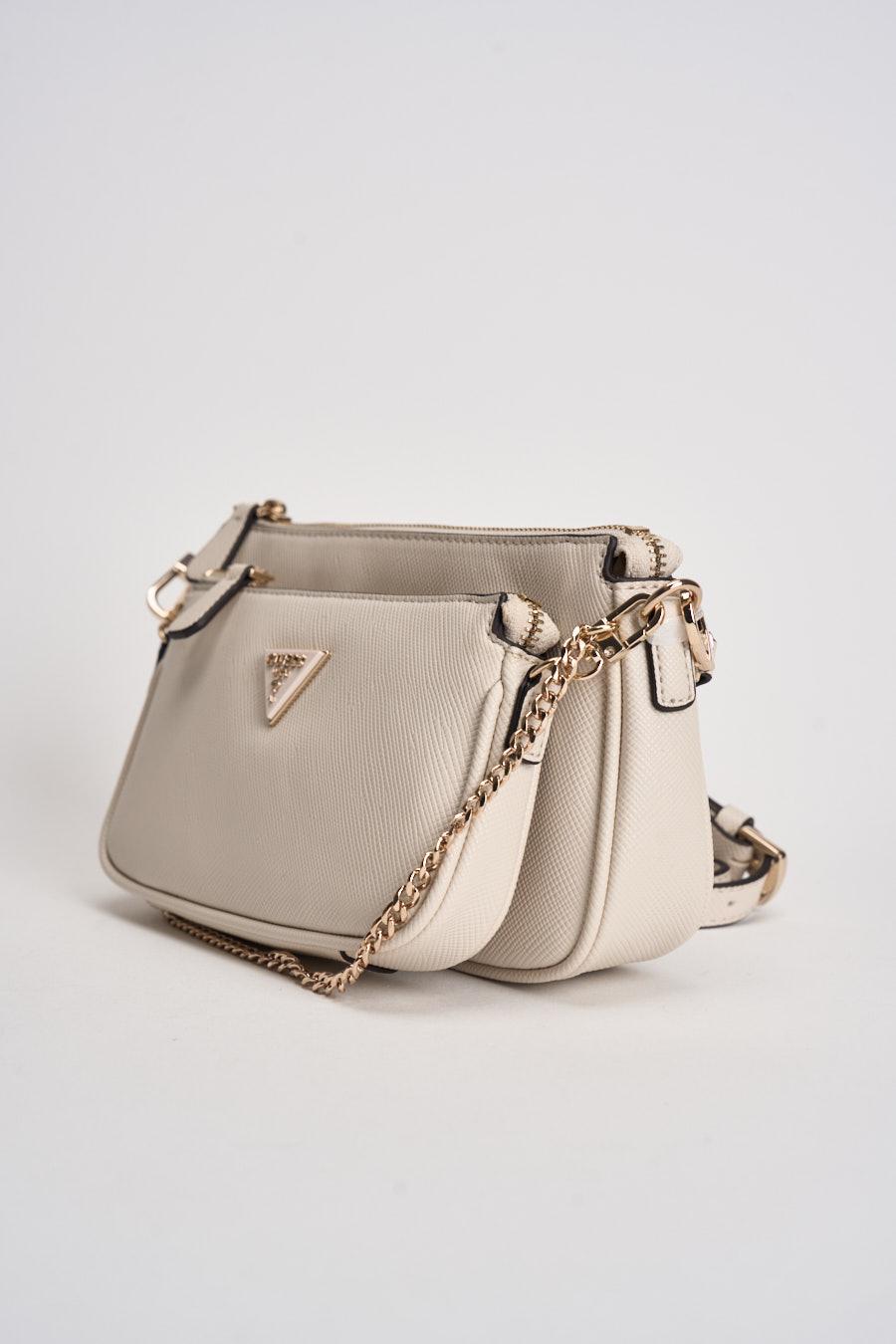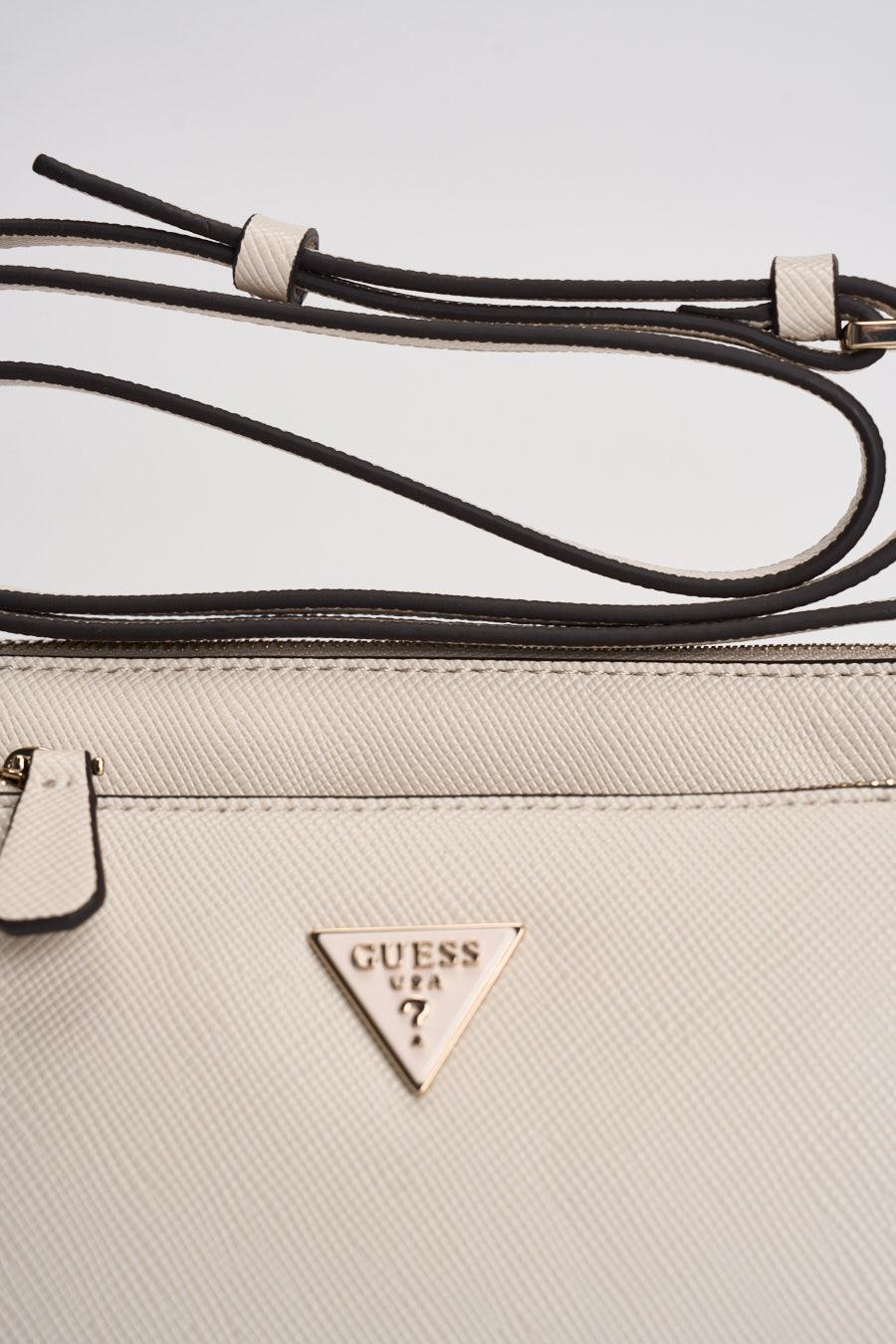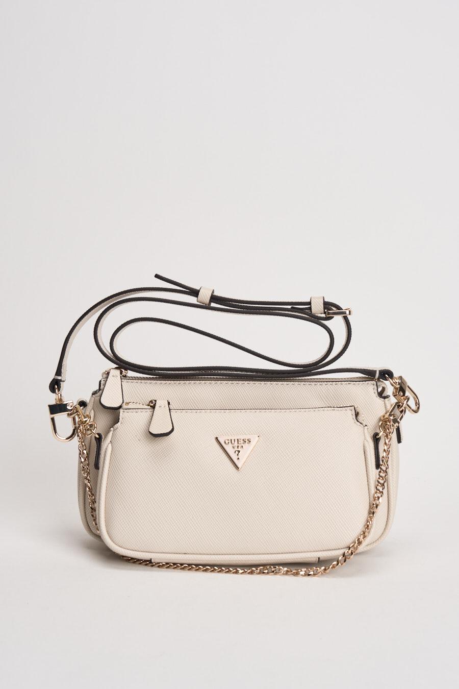 GUESS Borsa donna a tracolla bianca. Modello lavorazione saffiano con doppio manico, uno in ecopelle e una a catena dorata entrambe staccabili. Patch logo sul davanti e chiusura con zip. Tasca esterna frontale chiusa con zip. Composizione: ecopelle. Dimensioni: 24x13x5 cm.