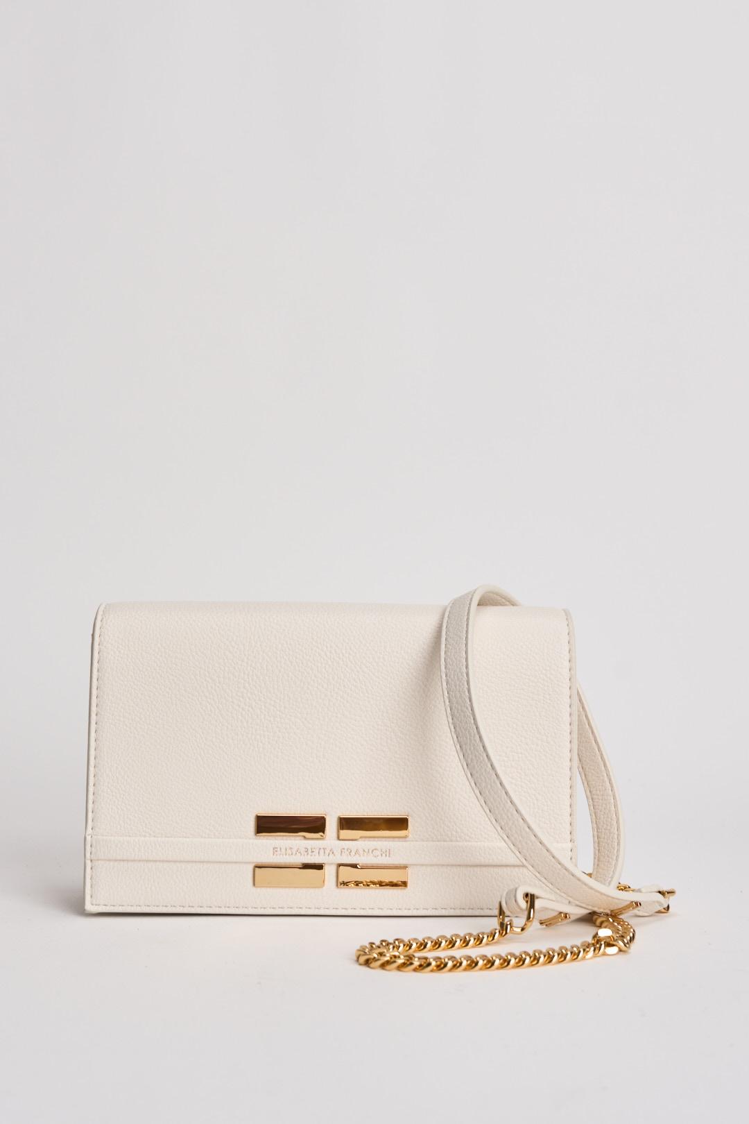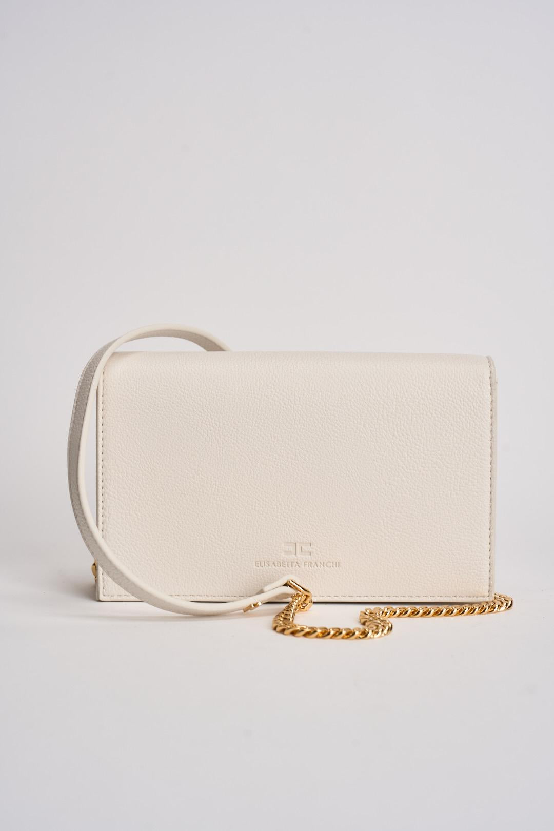 ELISABETTA FRANCHI Borsa donna a tracolla burro. Modello impreziosito da dettaglio con logo in metallo dorato applicato frontalmente. Il nome del brand è presente sia sul davanti che sul retro. Tracolla a catena con inserto in pelle removibile tarmite gancio. Composizione in pelle