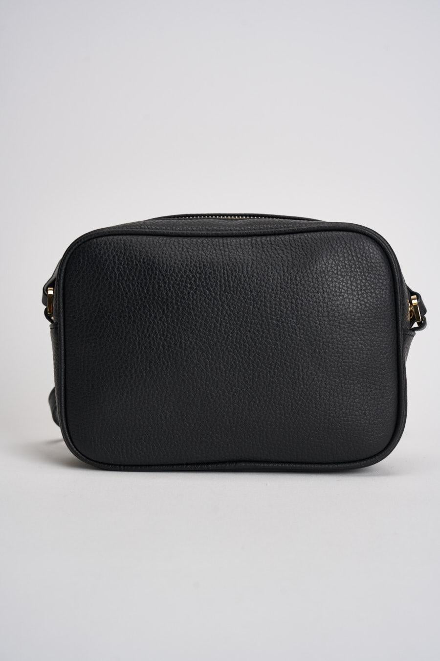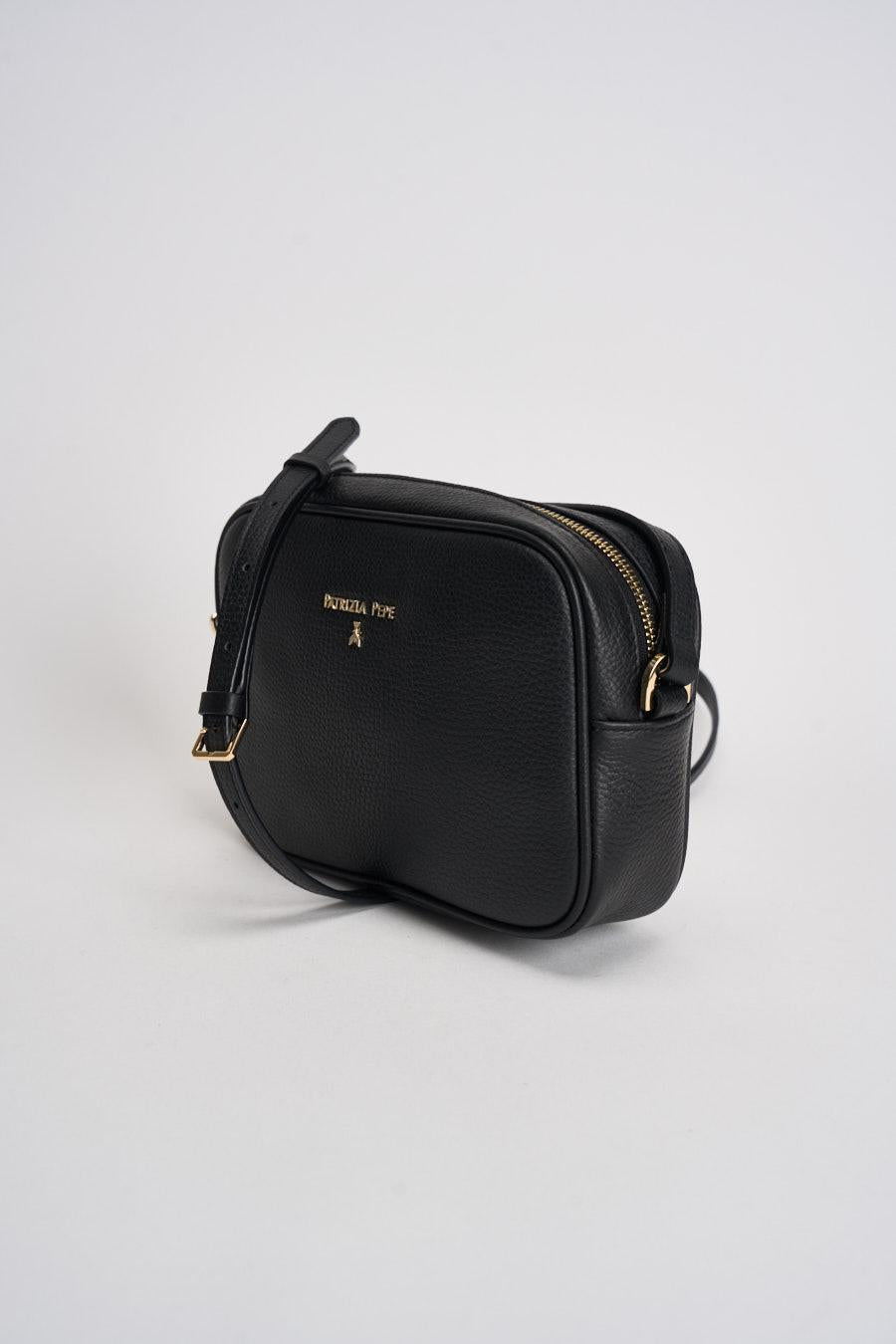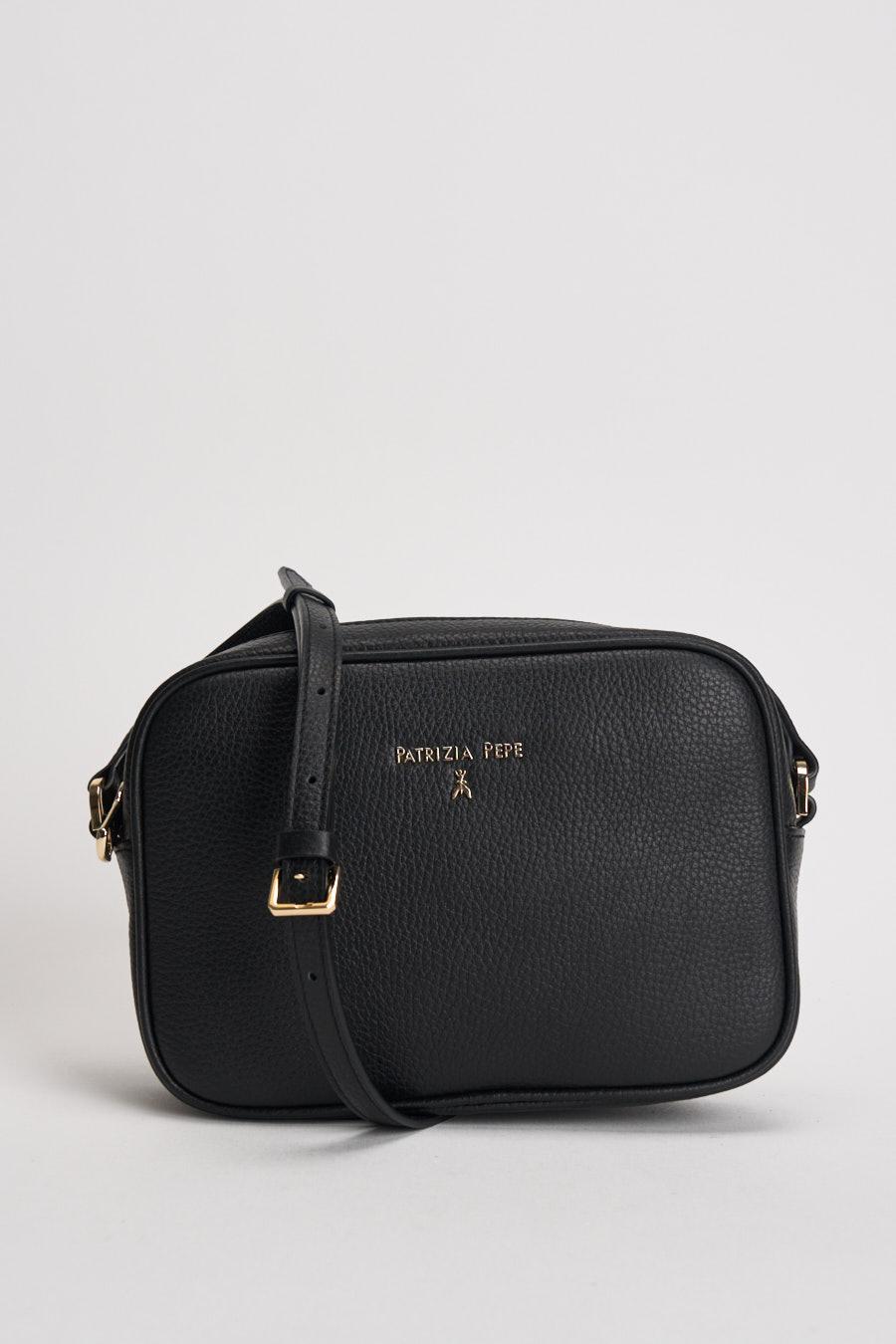 PATRIZIA PEPE Borsa donna a tracolla nera. Modello in pelle, chiusura con zip, regolabile cinghia di spalla, finiture in metallo oro. Fodera interna logata in poliestere, uno scomparto principale e tasca interna. Misure: 22x17x6cm. Composizione: 100% pelle.