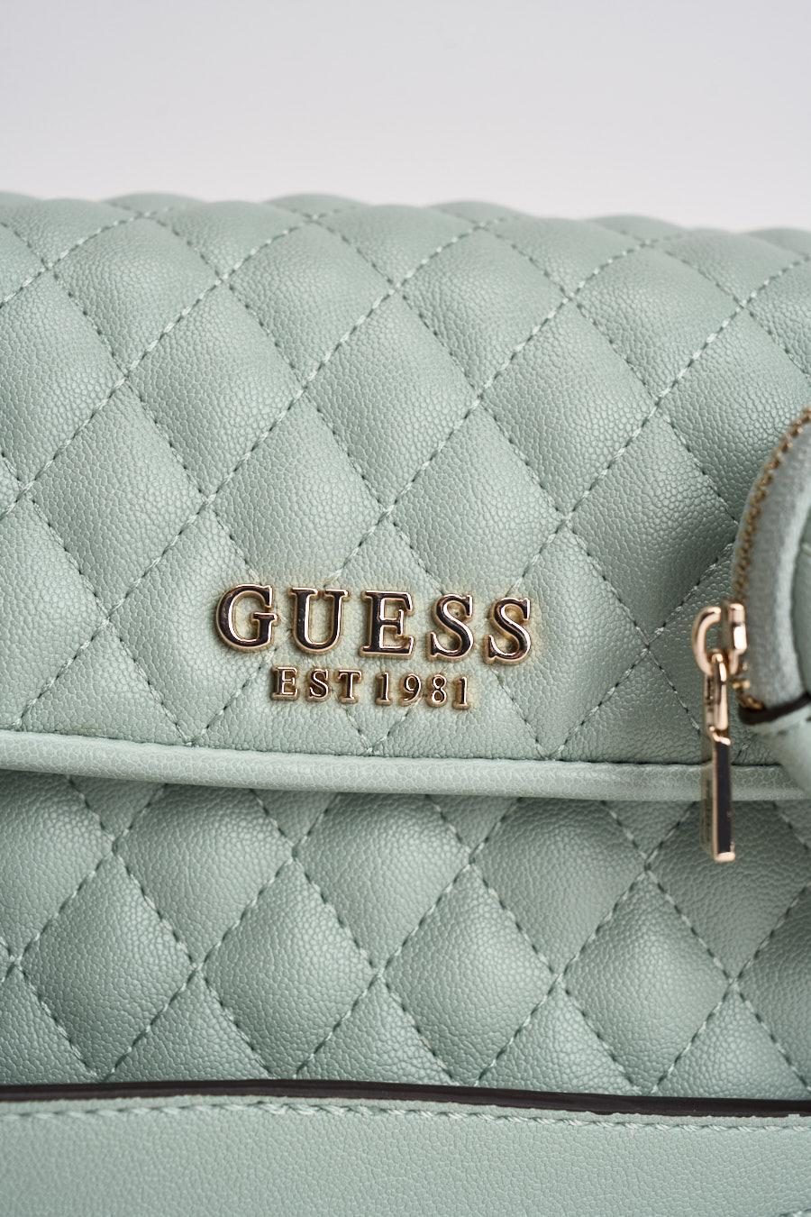 GUESS Borsa donna a tracolla verde acqua matelassé. Modello lavorazione matelassé, patta frontale e chiusura con zip. Scomparto principale capiente e tasca esterna con zip sul retro. Tracolla a catena con inserti in similpelle. Logo GUESS in metallo dorato sul davanti, pouch coordinata a forma di cuore con zip e logo frontale. Misure: 23x16x6 cm. Composizione 100% poliuretano.