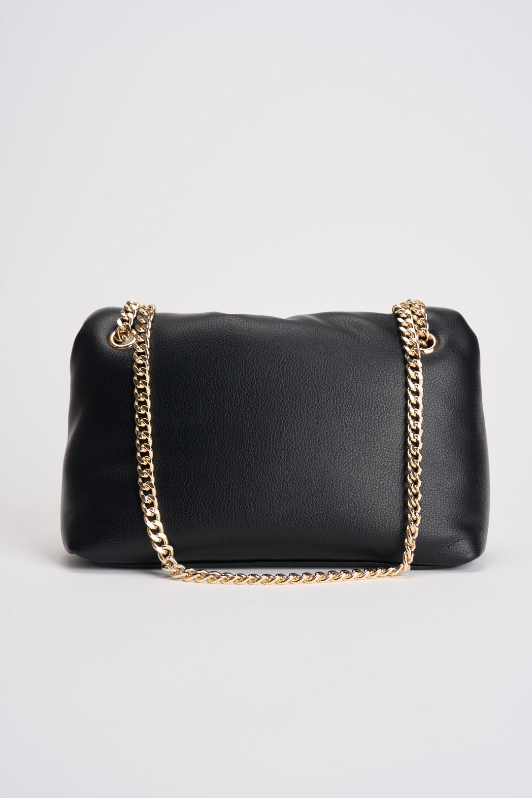 GAELLE Borsa donna in ecopelle nera. Modello con catena dorata e manico in ecopelle da portare o a spalla o a tracolla. Brand dorato sul davanti. Dimensioni: 27,5 x 18 x 10. Composizione: 100% Poliuretano.