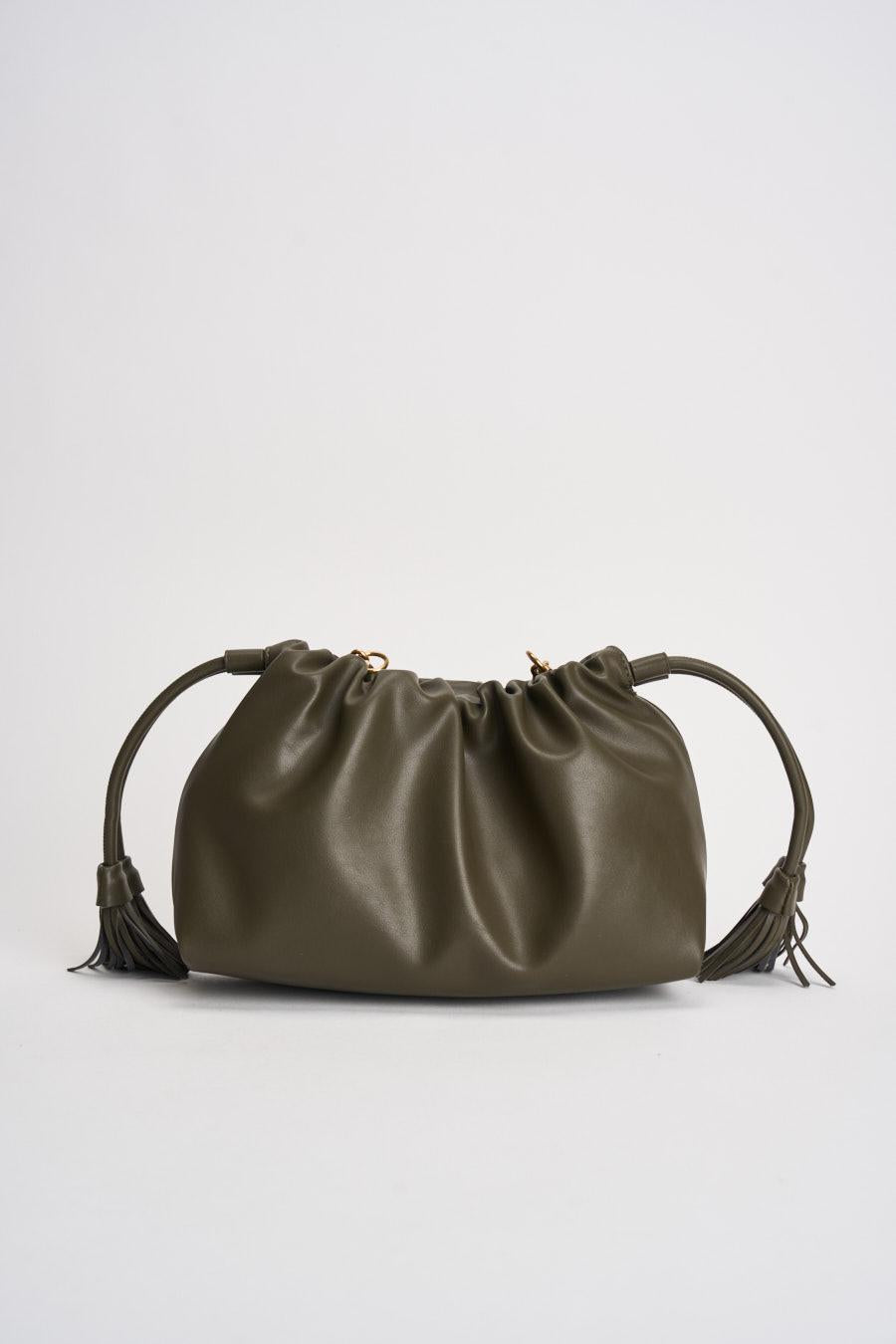 VICOLO Borsa donna in ecopelle verde militare. Modello con unico scomparto e dettaglio coulisse sul bordo regolabile con nappine. Chiusura con bottone a pressione e calamita. Dettaglio tracolla catena V metal plate Vicolo removibile. Tasca interna con cerniera e taschina piatta. Composizione: Poliestere 100%. Misura: 25x8x16 cm.
