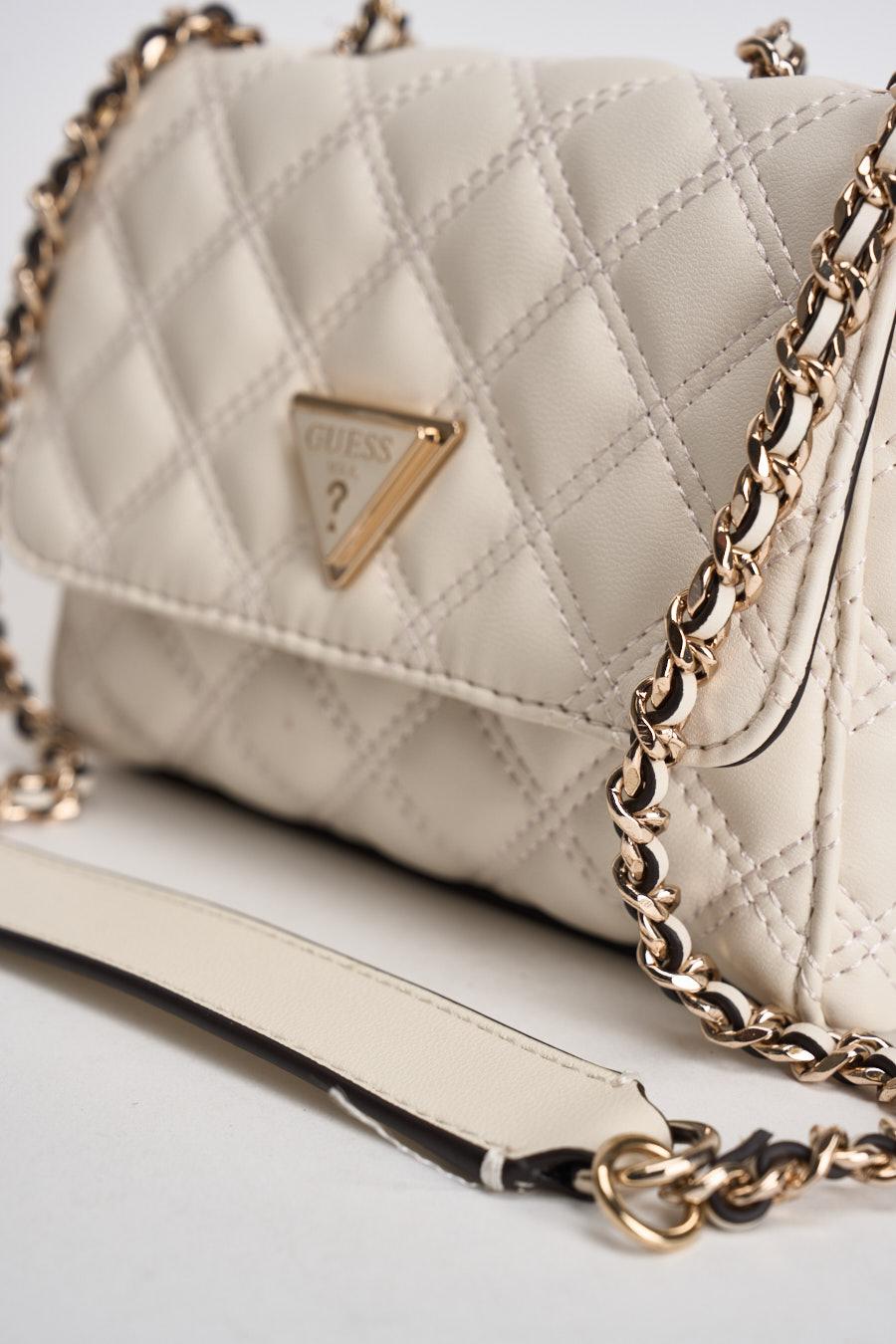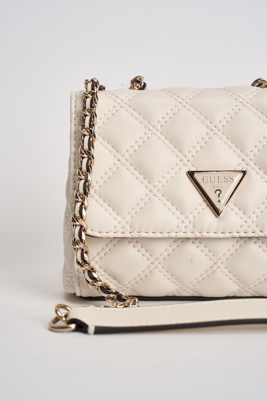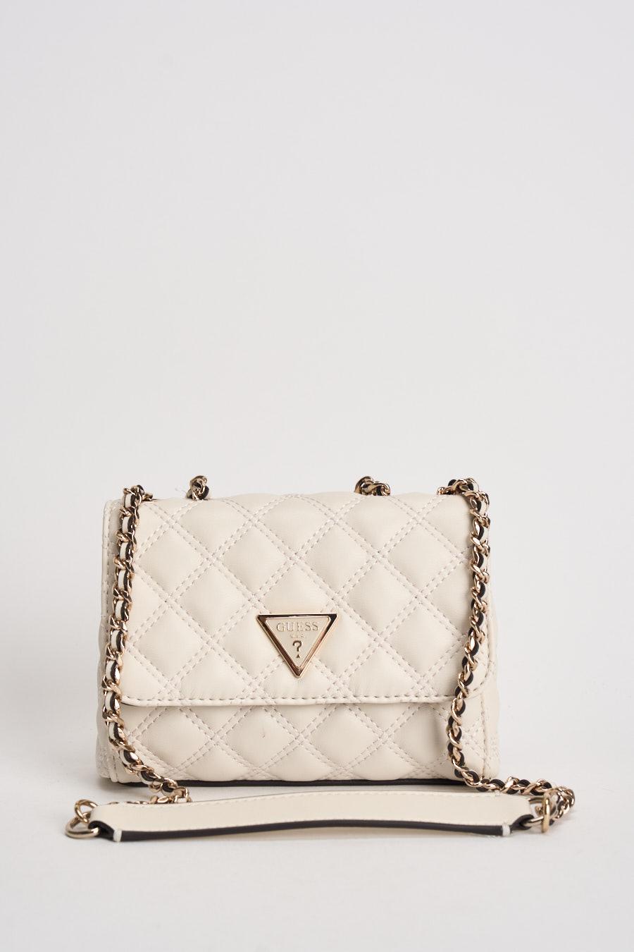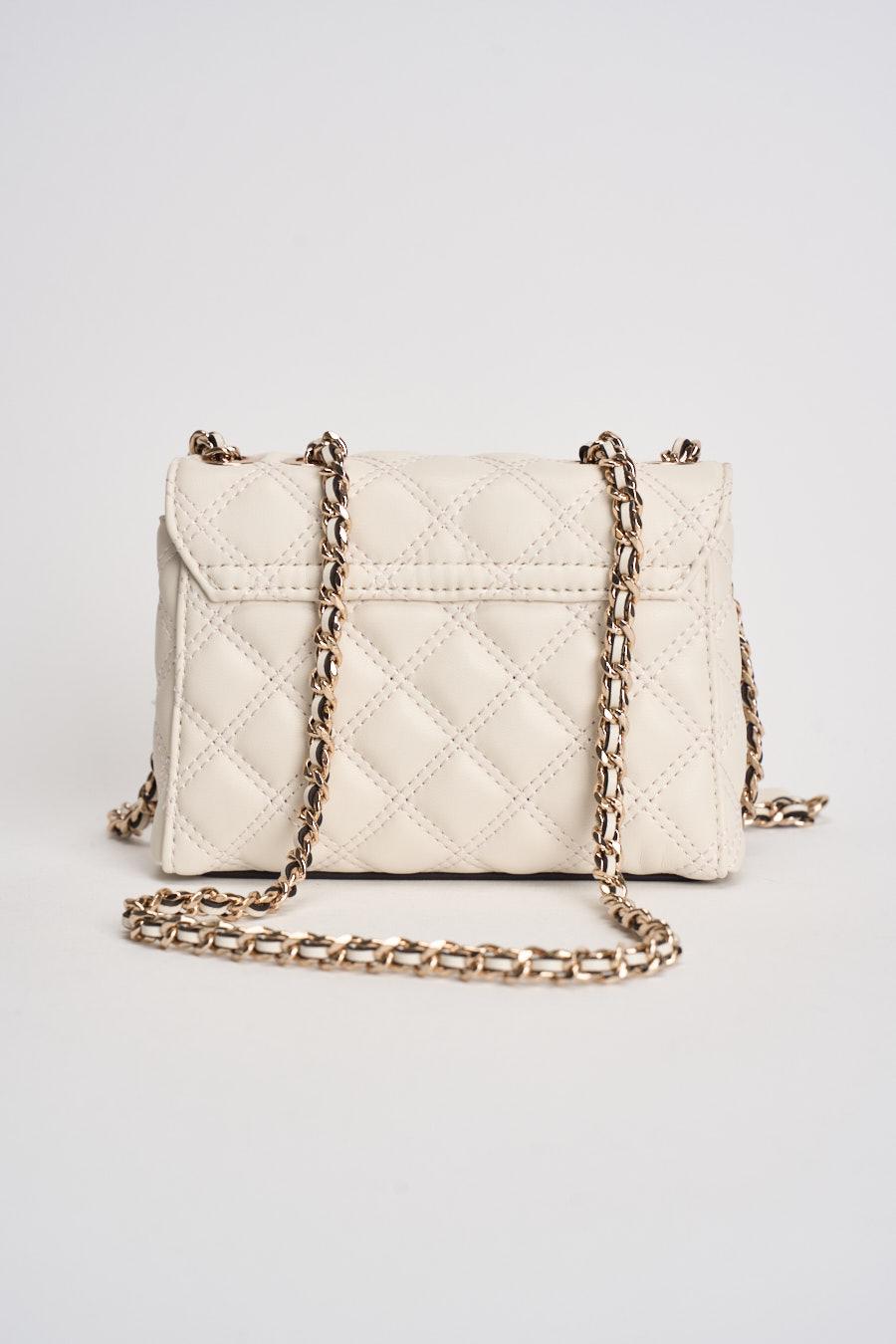 GUESS Borsa donna matelassé a tracolla bianca. Modello mini con lavorazione trapuntata e patta frontale. Uno scomparto principale con chiusura a calamita. Tracolla a catena con inserto effetto pelle. Logo triangolare GUESS in metallo applicato sul davanti. Dimensioni: 18 x 12 x 6 cm. Composizione 100% poliuretano.