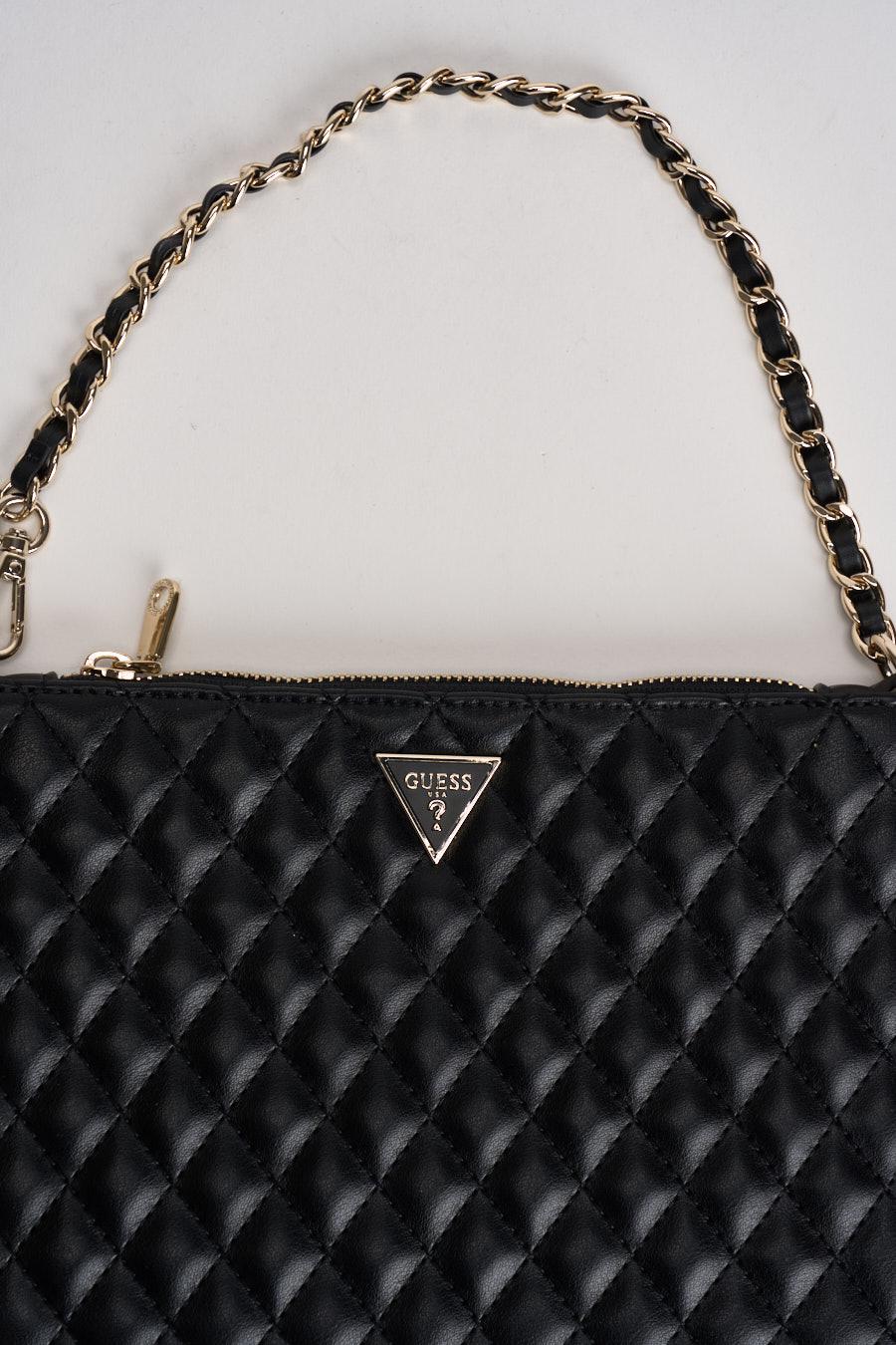 GUESS Borsa donna nera trapuntata. Modello con lavorazione matelassé a rombi, uno scomparto principale con chiusura superiore con zip e manico a catena con inserto effetto pelle. Logo triangolare GUESS applicato sul davanti in metallo. Misure: 24x2x16 cm. Composizione 100% poliuretano.