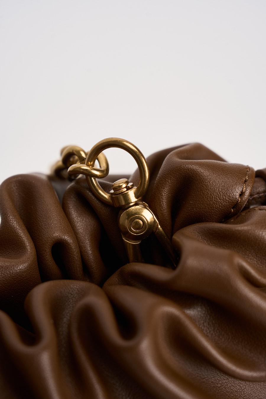 VICOLO Borsa donna in ecopelle marrone. Modello con unico scomparto e dettaglio coulisse sul bordo regolabile con nappine. Chiusura con bottone a pressione e calamita. Dettaglio tracolla catena V metal plate Vicolo removibile. Tasca interna con cerniera e taschina piatta. Composizione: Poliestere 100%. Misura: 25x8x16 cm.